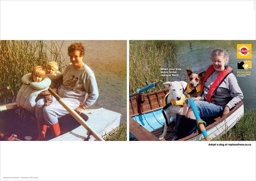 Η γνωστή εταιρεία τροφών για κατοικίδια Pedigree δημιούργησε το νέο της διαφημιστικό Treehouse που έχει σαν ιδέα το πιο πάνω, αντικαθιστώντας τα παιδιά με κατοικίδια. Με το σύνθημα μάλιστα “Replace your Kids. Adopt a dog” η εταιρεία παρακινεί τους “εγκαταλειμμένους” γονείς να υιοθετήσουν ένα εγκαταλειμμένο ζωάκι από κάποιο καταφύγιο.