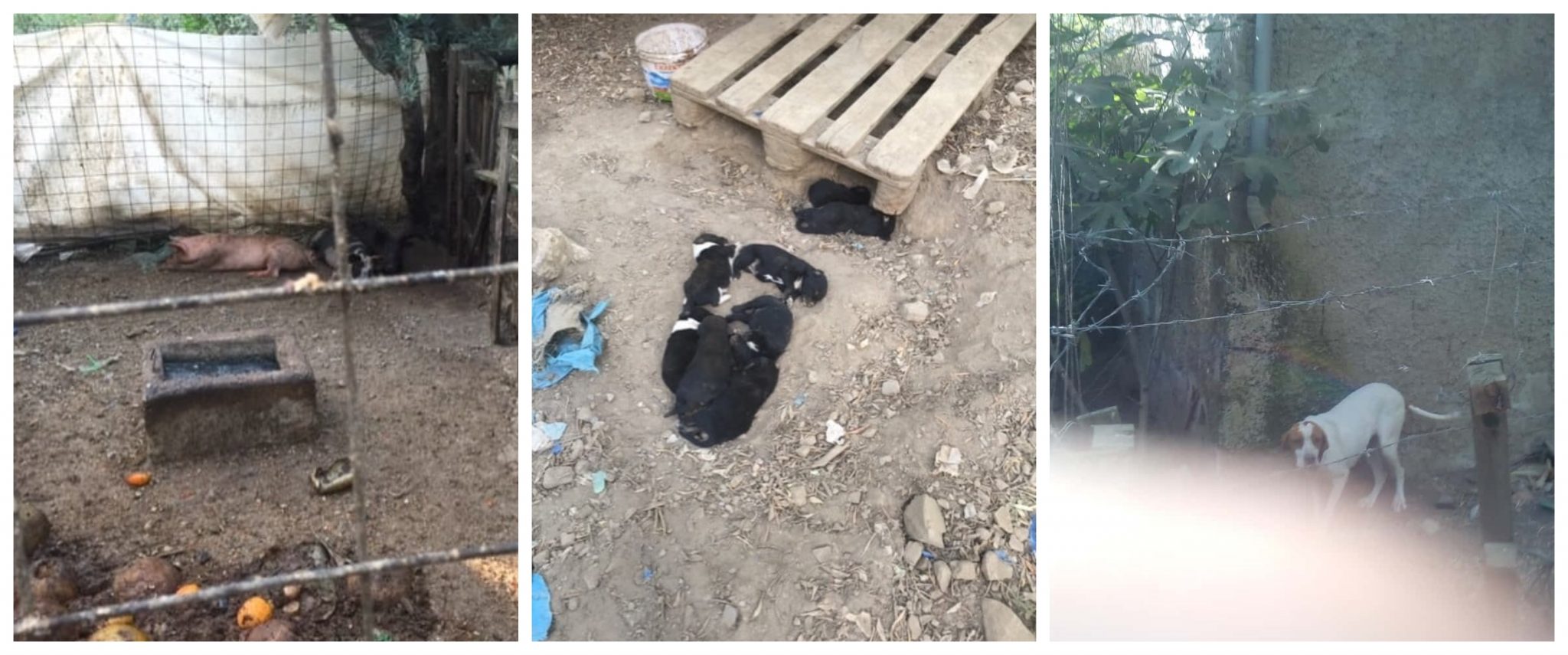 Μαζί μου επικοινώνησαν προχθές αλλοδαποί, οι οποίοι εντόπισαν το καλά κρυμμένο μέρος από κλάματα ζώων. Μεταβήκαμε μαζί στο σημείο, το οποίο αποτελεί μια υγειονομική βόμβα. Μια απίστευτα βρώμικη κατάσταση με παντού σάπιες τροφές, νερά κατάμαυρα από τη βρώμα. Τα γουρούνια ζούσαν μέσα σε ένα χολερικό μέρος, τα κουνέλια σε μικρά καταβρώμικα κλουβιά, τα σκυλιά ήταν αλυσοδεμένα με βαριές κοντές αλυσίδες βαρυποινίτη, χωρίς ίσκιο. Παντού στο χώρο υπήρχαν βαρέλια χιλιοτρύπητα, σκεύη άθλια και άδεια από νερό και 8 κουταβάκια ενός μήνα εξαντλημένα από τη ζέστη, με τη μητέρα τους να μην μπορεί να τα φτάσει λόγω της κοντής αλυσίδας.