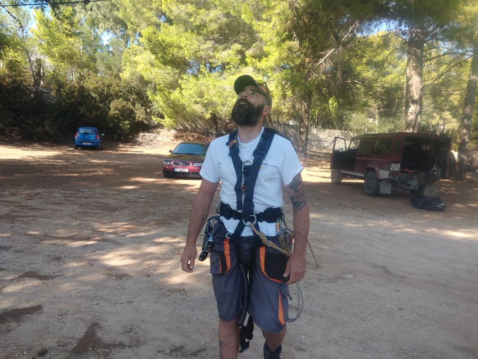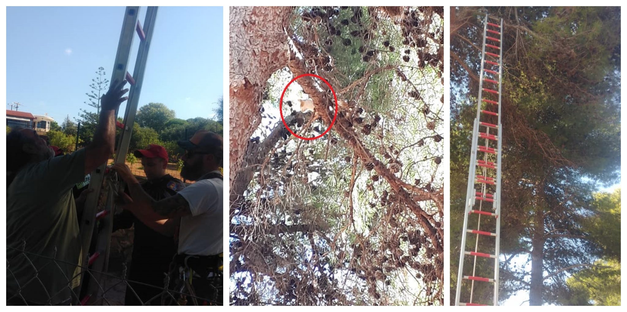Πιο συγκεκριμένα η γάτα είχε εγκλωβιστεί σε ύψος περίπου 20 μέτρων στα κλαδιά ενός πεύκου, στην προσπάθειά της να γλυτώσει από τα σκυλιά του ιδιοκτήτη που όργωναν το χωράφι από κάτω και φυσικά την παραφύλαγαν για να τη σκοτώσουν.