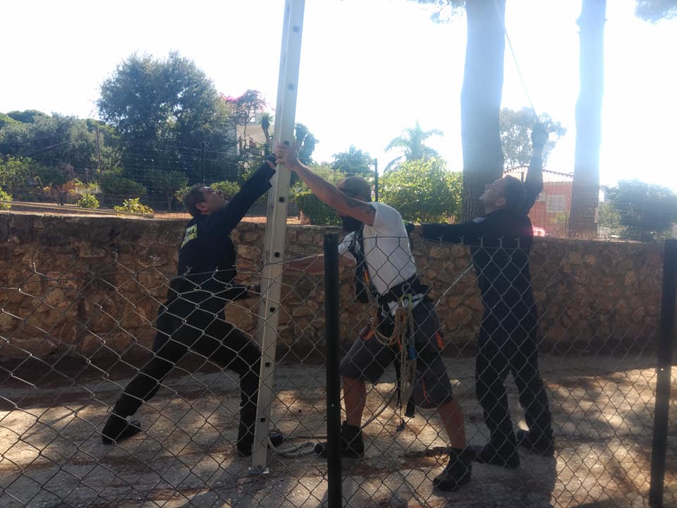 Το πλάνο ήταν το εξής: Με το τηλεσκοπικό γερανό να κρεμαστεί με σχοινιά ο Γιώργος από το γάντζο ώστε να είναι εύκολη η μετακίνησή του από τον χειριστή του γερανού για να πλησιάσει τη γάτα και να την κατεβάσει με ασφάλεια..