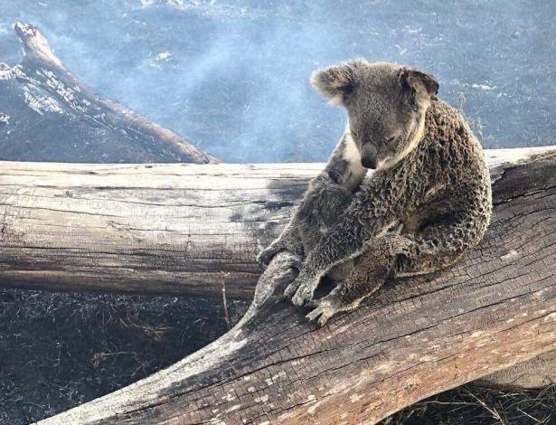 This mama koala, burned from fires raging across Australia, shields her baby from the smoke on a fallen tree on the Gold Coast. Doing whatever we can to survive and protect our children is not only a human trait.