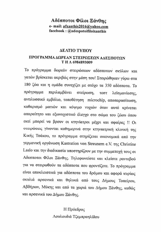 Σε εξέλιξη είναι το πρόγραμμα δωρεάν στειρώσεων αδέσποτων ζώων, σύμφωνα με το Δελτίο Τύπου του συλλόγου ¨Αδέσποτοι Φίλοι Ξάνθης».