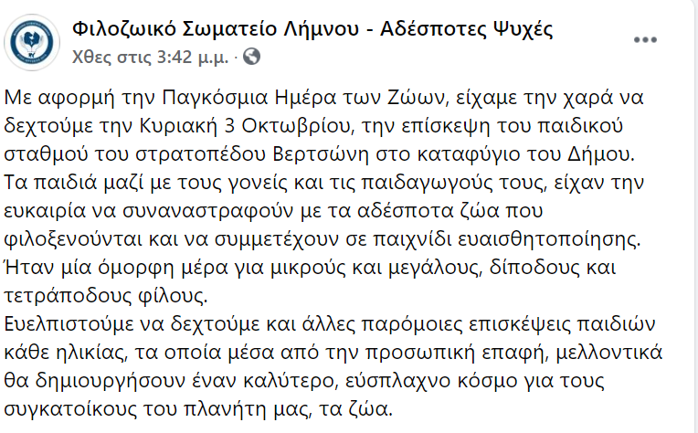 Πρόκειται, όπως αναφέρουν οι εθελοντές του Φιλοζωικού Σωματείου Λήμνου Φιλοζωικό Σωματείο Λήμνου – Αδέσποτες Ψυχές για τα παιδάκια του παιδικού σταθμού του στρατοπέδου Βερτσώνη, στη Λήμνο, τα οποία, με αφορμή την Παγκόσμια Ημέρα των Ζώων, που ήταν στις 4 Οκτωβρίου, επισκέφτηκαν μια μέρα πριν, την Κυριακή 3 Οκτωβρίου, το καταφύγιο του Δήμου.