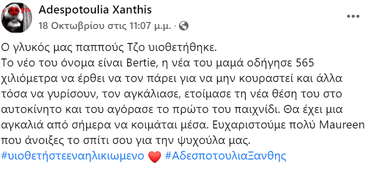 Τα Adespotoulia Xanthis τον ανέλαβαν όπως και αμέτρητα άλλα ζώα σε ανάγκη. Όπως μάλιστα αναφέρουν οι ίδιοι χαρακτηριστικά, η μέρα εκείνη μάλλον ήταν η πιο ευτυχισμένη του μέχρι τότε.