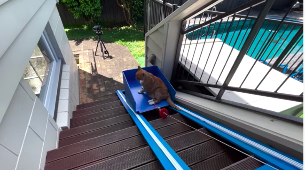 Ο Frodo είναι 20 ετών και είναι πλέον δύσκολο να ανεβοκατεβαίνει τις σκάλες του σπιτιού για να πηγαίνει και να κάθεται στο αγαπημένο του μέρος, δίπλα σε μια πισίνα και να λιάζεται με τις ώρες. Έπρεπε να κάνει κάτι για αυτόν. Έκατσε και σκέφτηκε και του ήρθε μια πολύ πρωτότυπη ιδέα για να διευκολύνει τον τετράποδο φίλο του.