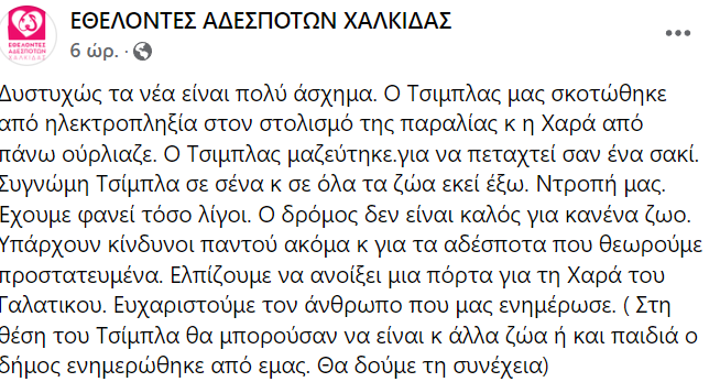 Ναι, σε αυτή τη χώρα όλα μπορούν να συμβούν. Όπως μας ενημερώνουν οι Εθελοντές Αδέσποτων Χαλκίδας ΕΘΕΛΟΝΤΕΣ ΑΔΕΣΠΟΤΩΝ ΧΑΛΚΙΔΑΣ εδώ και κάποιες μέρες έψαχναν τον αδέσποτο Τσίμπλα, ο οποίος είχε εξαφανιστεί από τα στέκια του, όπου τον φρόντιζαν. Και άρχισαν τις εκκλήσεις για βοήθεια. Μήπως κάποιος τον είδε ή μήπως κάποιος ξέρει κάτι.