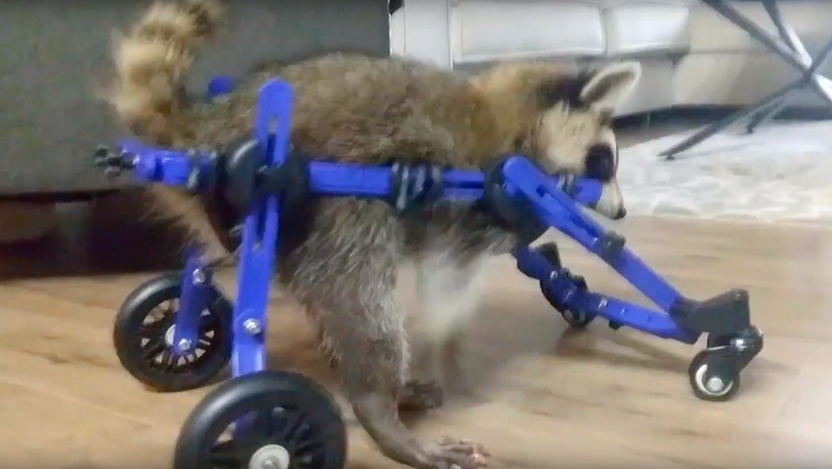 Ένα μικρούλι ανάπηρο ρακούν περπατάει και πάλι με αναπηρικό καροτσάκι