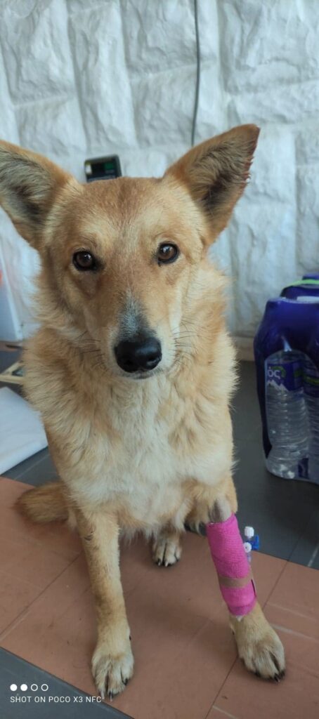 Πριν από λίγο καιρό ένα αυτοκίνητο τη χτύπησε επίτηδες. Δεν μπόρεσαν δυστυχώς να συγκρατήσουν τον αριθμό του. Οι εθελοντές της ομάδας την μετέφεραν σε κτηνιατρείο, όπου πραγματικά έδωσε μάχη για τη ζωή της. Ήταν σε σοκ, σχεδόν σε κώμα, με εσωτερική αιμορραγία. Αλλά τα τα κατάφερε. Μέσα στην ατυχία της στάθηκε τυχερή.