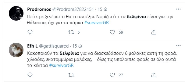 Αρκετά αρνητικά σχόλια στο Twitter προκάλεσε το έπαθλο που κέρδισαν το βράδυ της Κυριακής (9/5) οι παίκτες της μπλε ομάδας στο «Survivor 4». H επιλογή της παραγωγής να πάει τους παίκτες στο Πάρκο Δελφινιών στην Πούντα Κάνα και η εικόνα αιχμάλωτων ζώων να προβάλλονται ως μέσα αναψυχής δε φάνηκε να αρέσει και τόσο στους χρήστες του Διαδικτύου, οι οποίοι έσπευσαν να εκφράσουν την αντίθεσή τους.