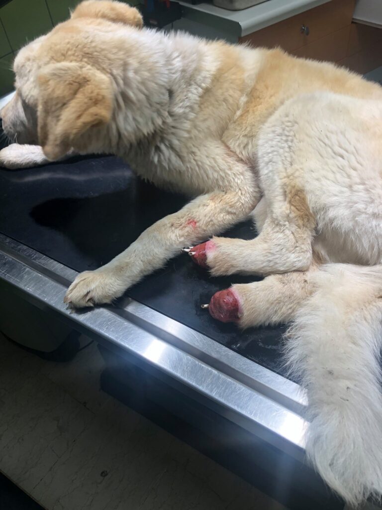 Όταν το πλησίασαν είδα την τραγική κατάστασή του. Τα πατουσάκια από τα πίσω πόδια του λείπουν εντελώς και τα κόκαλά του είχαν βγει έξω και ήταν ορατά.
