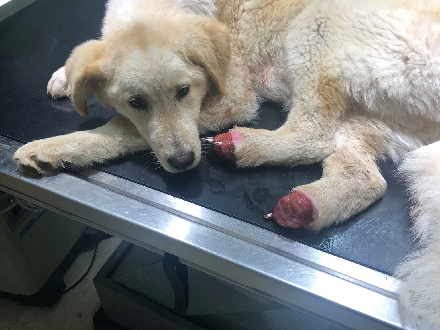 Οι εθελοντές το μετέφεραν άμεσα στον κτηνίατρο. Και εκείνος σοκαρίστηκε με την εικόνα του άτυχου ζώου. Του δόθηκαν οι πρώτες βοήθειες, έγινε επίδεση, αποπαρασίτωση και πήρε αντιβίωση. Είναι αναιμικό και δεν γνωρίζουν ακόμα αν έχει κατάγματα αλλά ούτε και σε τι οφείλονται τα τραύματα. Πρόκειται να μεταφερθεί σε εξειδικευμένο κτηνίατρο- ορθοπεδικό.