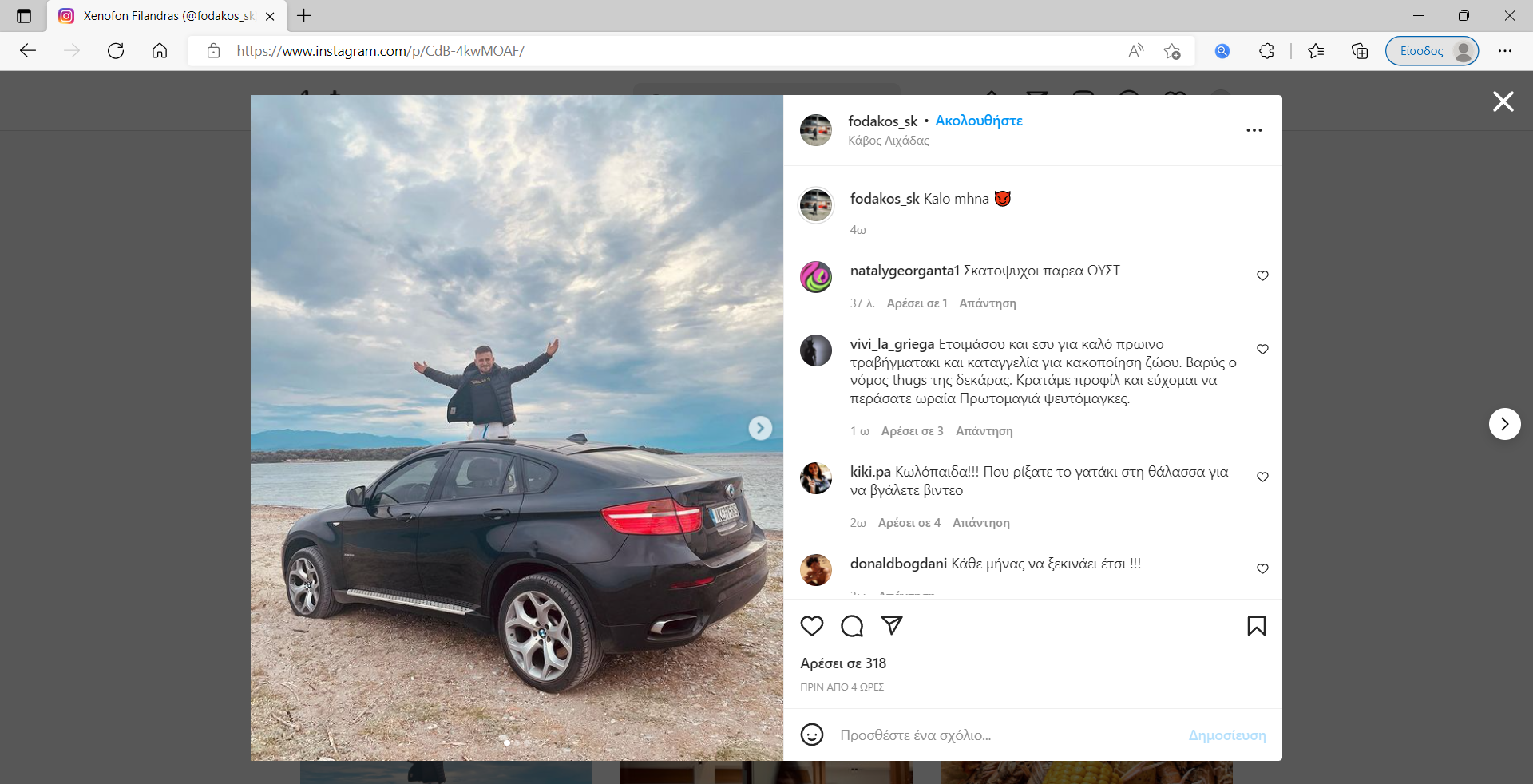 «Για να λήξει εδώ το θέμα, να μην υπάρχει συνέχεια από εμένα (…) ένα συγγνώμη για αυτό που έγινε χθες. Ναι, δεν είναι σωστό, δεν είναι ωραίο, ούτε κάτι που έπρεπε να γίνει. Ναι είχαμε πιει πέντε μπίρες παραπάνω, ένα ουζάκι παραπάνω, χα, χου χου, κάναμε μια μαλ@@@@. Στην ουσία δεν κλωτσήσαμε, σπρώξαμε το γατί και έπεσε κάτω στο χαλίκι, στους 20 πόντους, στην παραλία» ανέφερε σε ένα από τα βίντεο που ανέβασε στο instagram ο νεαρός, πριν αρχίσει να βρίζει με απίστευτη επιθετικότητα όσους τον κατέκριναν. Ισχυρίζεται δε ότι πλήρωσε 50 ευρώ για να πάρει ψάρια και να ταΐσει τα γατάκια. Αστεία πράγματα. Στα όρια του γελοίου. Το ζώο φυσικά δεν έπεσε στην παραλία αλλά μέσα στη θάλασσα.