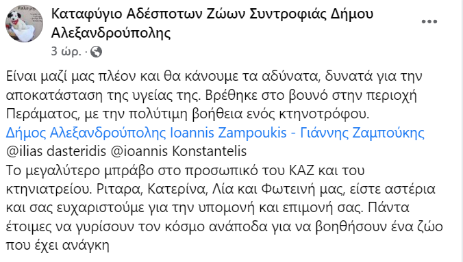 Τη σκυλίτσα είχε δει μια κοπέλα, η οποία ενημέρωσε τους ανθρώπους του Καταφύγιο Αδέσποτων Ζώων Συντροφιάς Δήμου Αλεξανδρούπολης. Εκείνοι, με την πολύτιμη βοήθεια ενός κτηνοτρόφου, κατάφεραν και την εντόπισαν εκ νέου και την έπιασαν.