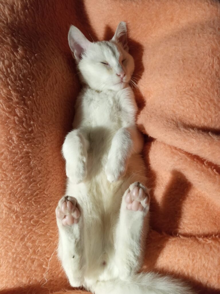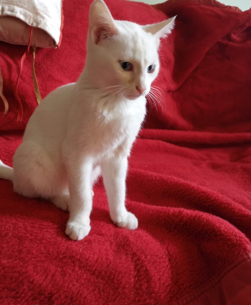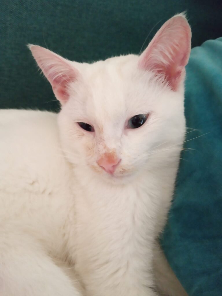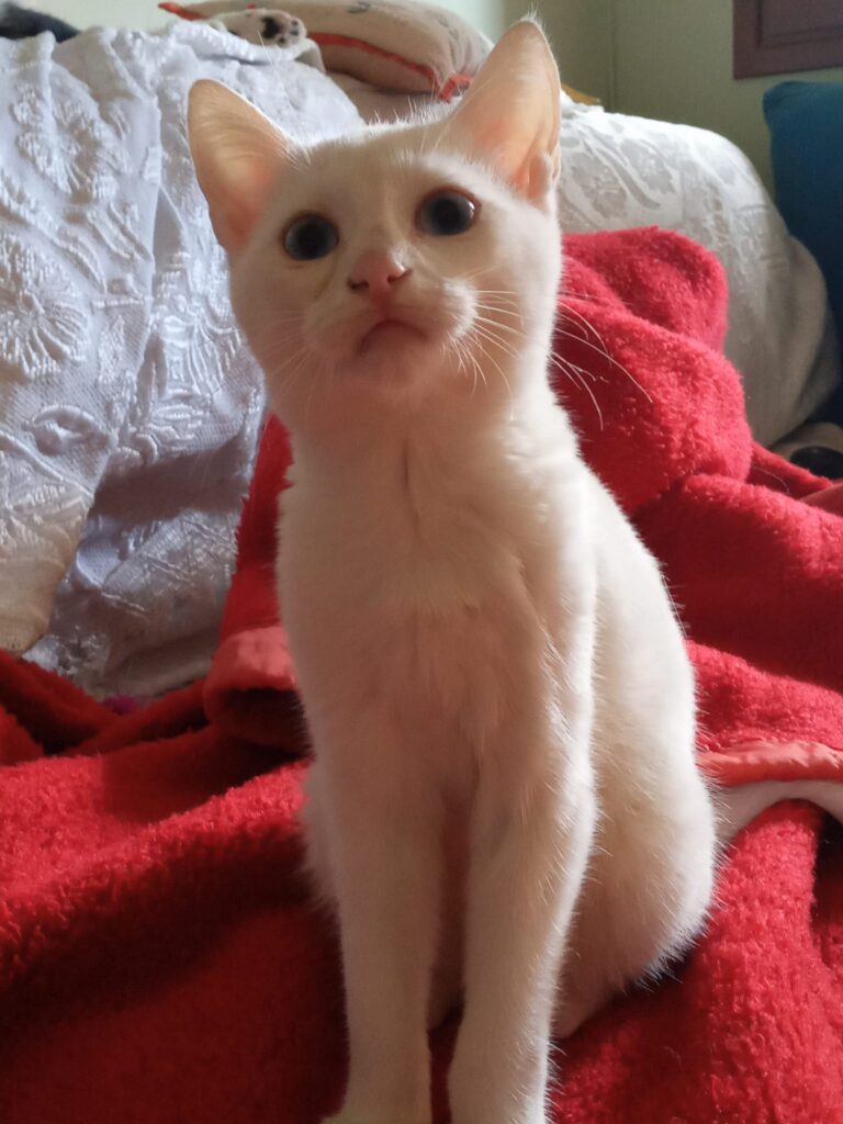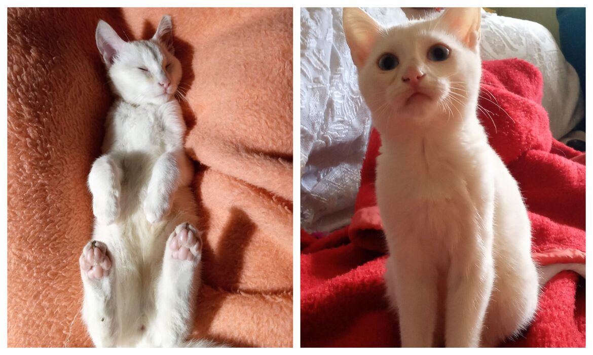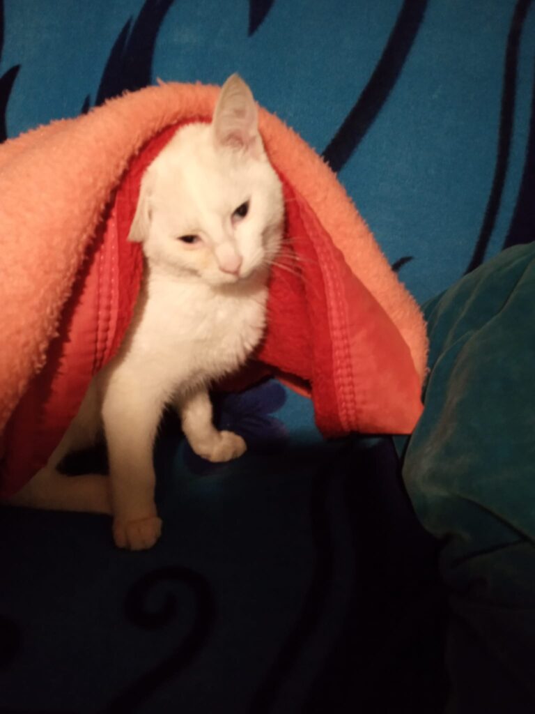 Ο γατούλης στις φωτογραφίες που ακολουθούν είναι ένας μικρός γαλανομάτης, που βρέθηκε ένα βράδυ στο δρόμο, μοναχούλης του μέσα στη βροχή. Έκλαιγε και προσπαθούσε να μπει κάπου να ζεσταθεί και να γλυτώσει τη βροχή και το κρύο. Αρρωστούλης και χωρίς τη μαμά του.