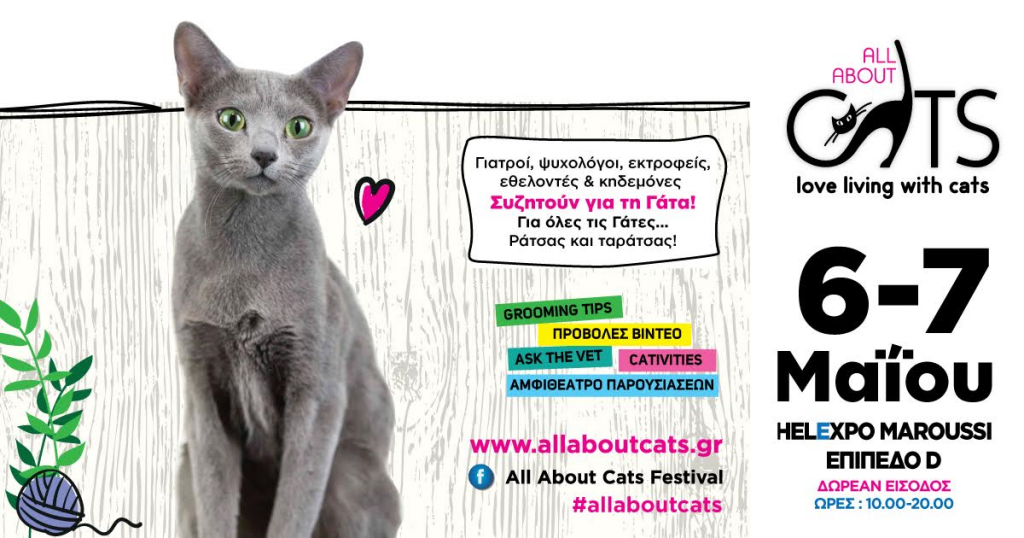 «Love living with cats». Αγαπάμε να ζούμε με τις γάτες μας. Αυτό είναι το σύνθημα του τρίτου διαδραστικού φεστιβάλ, που είναι αφιερωμένο στην αγάπη μας για τις γάτες. Η απόλυτη εκδήλωση για τις γάτες επιστρέφει για δεύτερη συνεχόμενη χρονιά στο Helexpo Maroussi το Σαββατοκύριακο 6 και 7 Μαΐου. Με ελεύθερη είσοδο, θα έχετε τη δυνατότητα να συμμετάσχετε ενεργά σε ένα φεστιβάλ, που έχει σχεδιαστεί με μοναδικό γνώμονα να φέρει τους πάντες κάτω από την ίδια στέγη: Γάτες και κηδεμόνες.