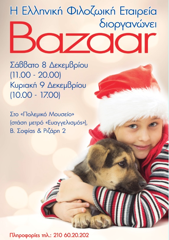 Το χριστουγεννιάτικο παζάρι της Ελληνικής Φιλοζωικής Εταιρείας θα πραγματοποιηθεί το Σάββατο 8 και την Κυριακή 9 Δεκεμβρίου 2018 στο «Πολεμικό Μουσείο», Αίθουσα «Φουαγιέ».