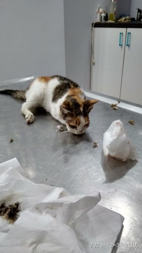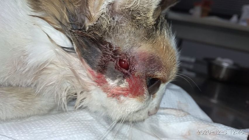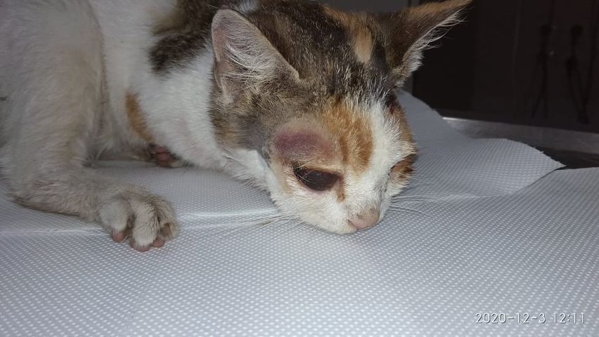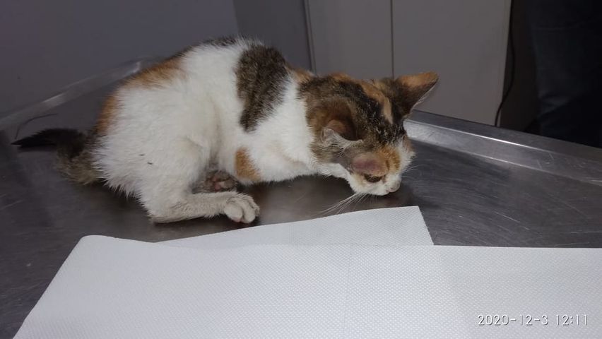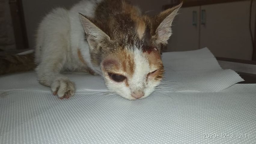 Το γατάκι μεταφέρθηκε από εθελόντρια σε κτηνιατρείο αλλά η κατάστασή του δεν είναι καλή. Είναι κρίσιμη. Όλο φυσικά αυτό είναι πολύ πιθανό να του δημιουργήσει σοβαρά νευρολογικά ή κινητικά προβλήματα. Η μεταλλική σφαίρα που το χτύπησε πέρασε από την αριστερή πλευρά του κρανίου και βγήκε πίσω από το δεξί ματάκι του.