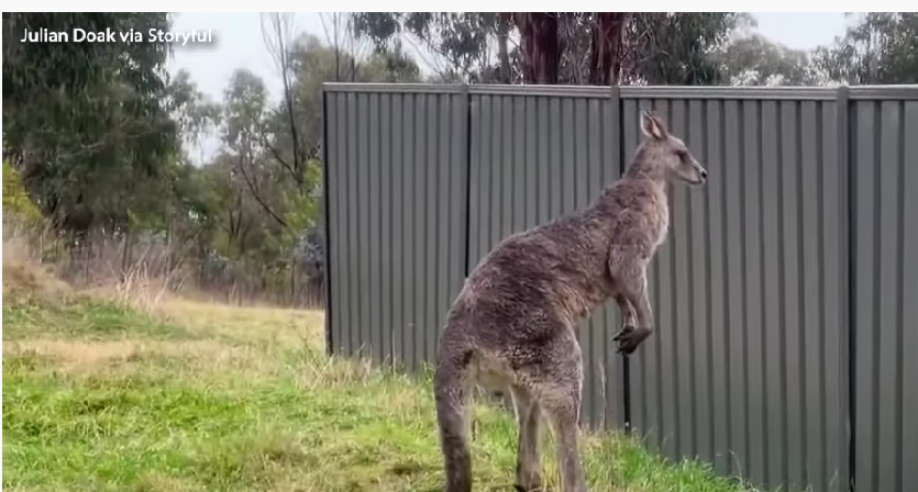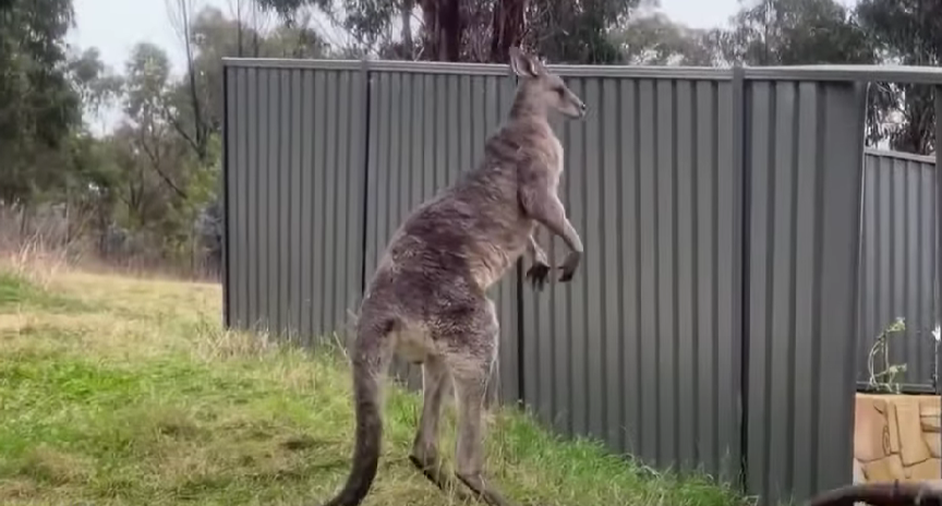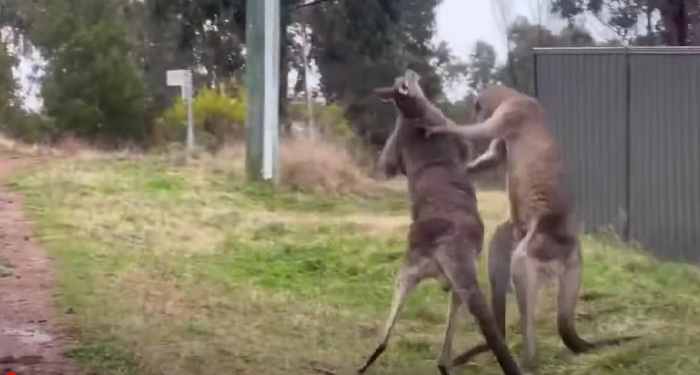 Μετά από μάχη στην κυριολεξία σώμα με σώμα, το ένα καγκουρό έσπρωξε με δύναμη το άλλο πάνω σε έναν φράχτη. Το χτύπημα ήταν τόσο δυνατό που το καγκουρό έσπασε τον φράχτη και πέρασε από την μέσα πλευρά.