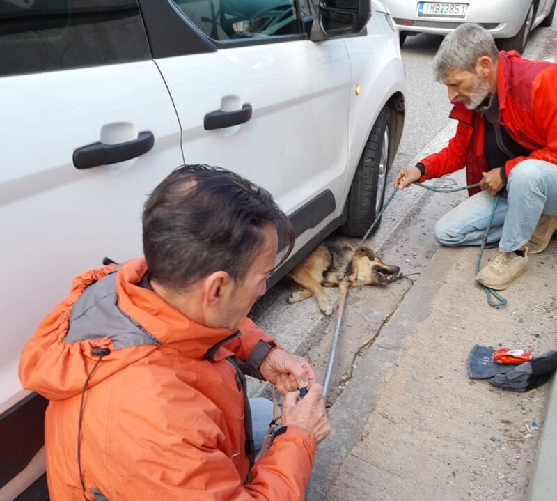 ”Ευχαριστούμε τον διασώστη Χρήστος Φιλοζωικό που έσπευσε αμέσως για βοήθεια και με τη συνδρομή του Βαγγέλη Σ. και ενώ η Τροχαία έλεγχε την κυκλοφορία, κατάφεραν να το βγάλουν με ασφάλεια τον σκύλο από το αυτοκίνητο και να τον μεταφέρουν στο αυτοκίνητό μας.