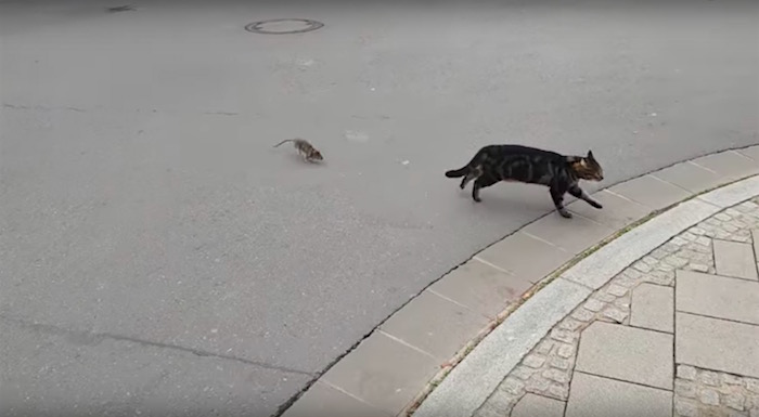 Η σκηνή εκτυλίχθηκε στην πόλη Esch-sur-Alzette του Λουξεμβούργου, όταν περαστικός τράβηξε σε βίντεο το σπάνιο περιστατικό στο οποίο η γάτα τρέπεται σε άτακτη φυγή στη θέα του αρουραίου. Το πλάνο δείχνει το φοβισμένο άλμα της γάτας στον αέρα, όταν το πιθανό του θήραμα αποδείχτηκε… κυνηγός. Δείτε και μόνοι σας…