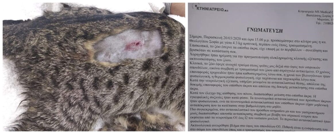 Δυστυχώς τα πράγματα είναι δύσκολα καθώς το βλήμα έχει καρφωθεί στο σπόνδυλο και του έχει νεκρώσει το πίσω μέρος του σώματος του. Ο γατούλης θα χρειαστεί να μείνει για πολύ καιρό στο κτηνιατρείο. Η εθελόντρια που τον φροντίζει δεν θέλει να του κάνει ευθανασία. Όμως πρέπει όλοι να βοηθήσουμε.