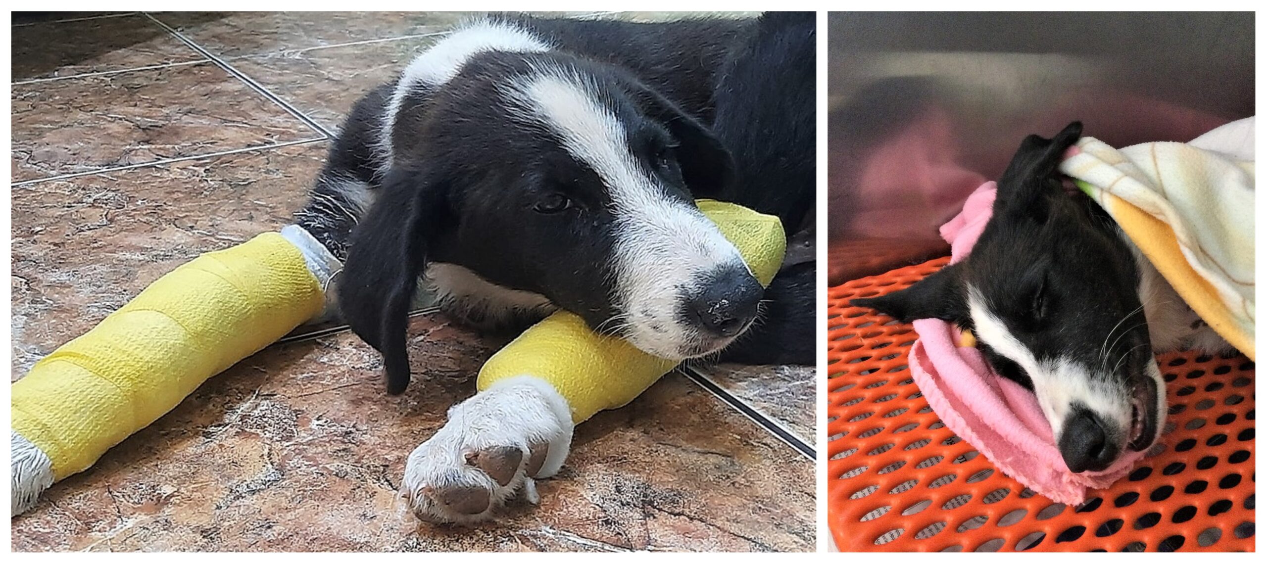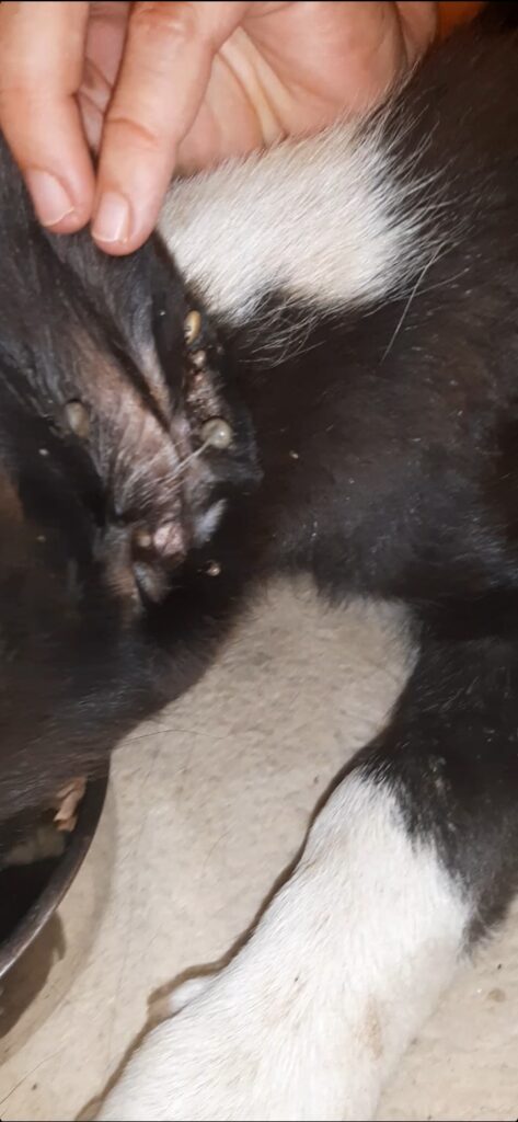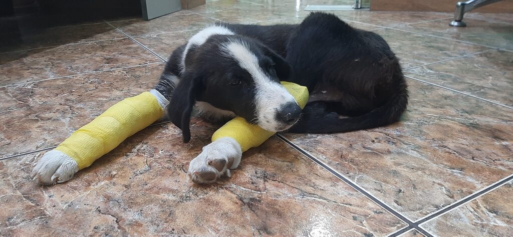 Ο Νικόλας βρέθηκε από εθελοντές και μεταφέρθηκε σε κτηνιατρείο. Δύο μπροστινά σπασμένα πόδια, πληγές, τσιμπούρια, ψύλλοι. Αυτή ήταν η κατάστασή του.