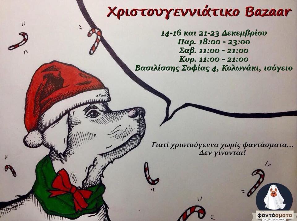 Το καθιερωμένο χριστουγεννιάτικο μπαζάρ της διοργανώνει η γνωστή φιλοζωική ομάδα “Τα Φαντάσματα του Ασπρόπυργου”, η οποία δραστηριοποιείται σε μια από τις πιο δύσκολες περιοχές της Ελλάδας, τον Ασπρόπυργο.