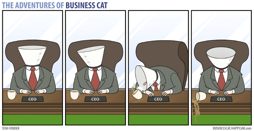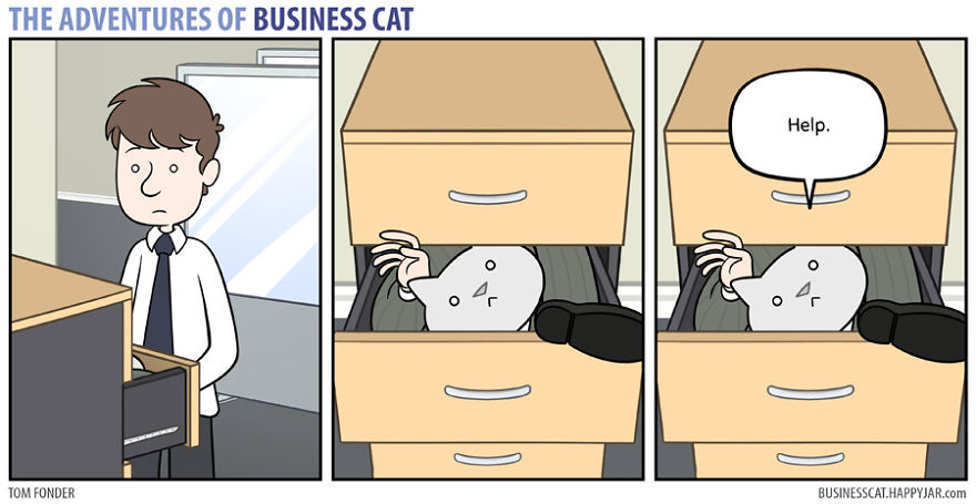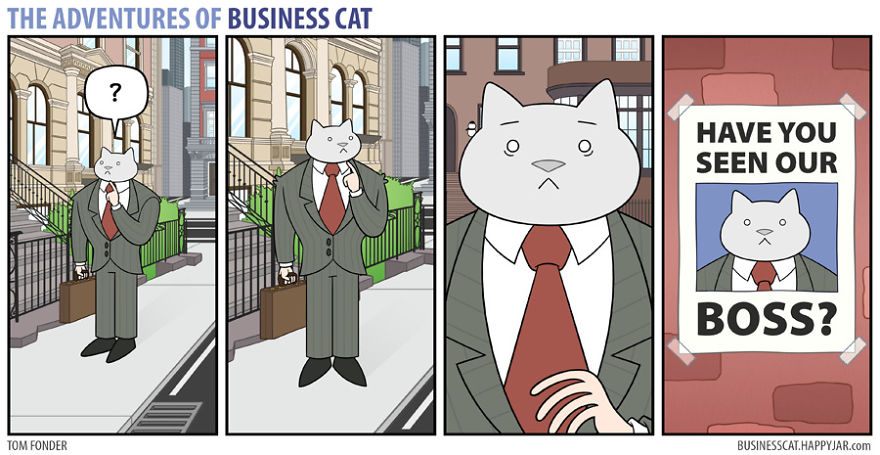 Ο καλλιτέχνης Tomy Fonder λάτρης αυτών των τετράποδων σκέφτηκε τη ζωή σε ένα γραφείο στο οποίο διευθυντής θα ήταν ένας γάτος. Έτσι δημιούργησε μια σειρά από κόμικ που λέγεται “The Adventures of Business Cat”. Πώς είναι μια τέτοια ζωή; Απόλυτα σουρεαλιστική.