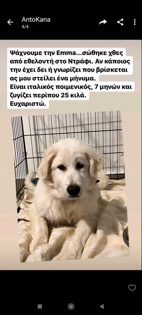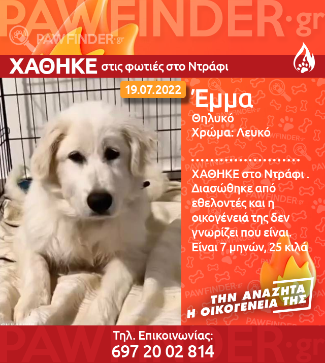 Ο κηδεμόνας της Έμμας βρέθηκε. Και κάνει έκκληση στον άνθρωπο που έχει το ζώο του να του το δώσει πίσω. Έχει μιλήσει με φιλοζωικές, με τους σταθμούς Πρώτων Βοηθειών για τα πυρόπληκτα ζώα που έχουν γίνει, με εθελοντές, με τον κύριο που την έβγαλε από το σπίτι. Κανείς δεν γνωρίζει τι έχει γίνει μετά τον απεγκλωβισμό της. Λέει μάλιστα ότι την πήρε μια κυρία, η οποία είχε σταθμεύσει με ένα Renault (μάλλον Clio) στη διασταύρωση Μιλτιάδου και Αχαιών στο Ντράφι, και μάζευε σκυλιά. Της ζητάει να του παραδώσει την Έμμα κάνοντάς της μια τελευταία έκκληση.