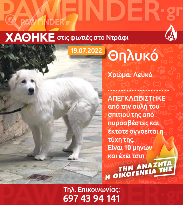 Τη σκυλίτσα τους πίσω ζητάνε οι άνθρωποι της Έμμας, ενός ζώου που διασώθηκε στις φωτιές από πυροσβέστες και εθελοντές από το σπίτι του στο Ντράφι και έκτοτε αγνοούνται τα ίχνη του.