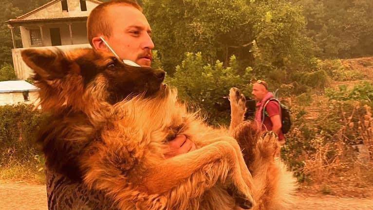 Η φωτογραφία είναι από τις φωτιές στις Γούβες Εύβοιας. Σε αυτή ο Anastasis Nik κρατάει στην αγκαλιά του ένα σκύλο, τον οποίο διασώζει από τις φλόγες.