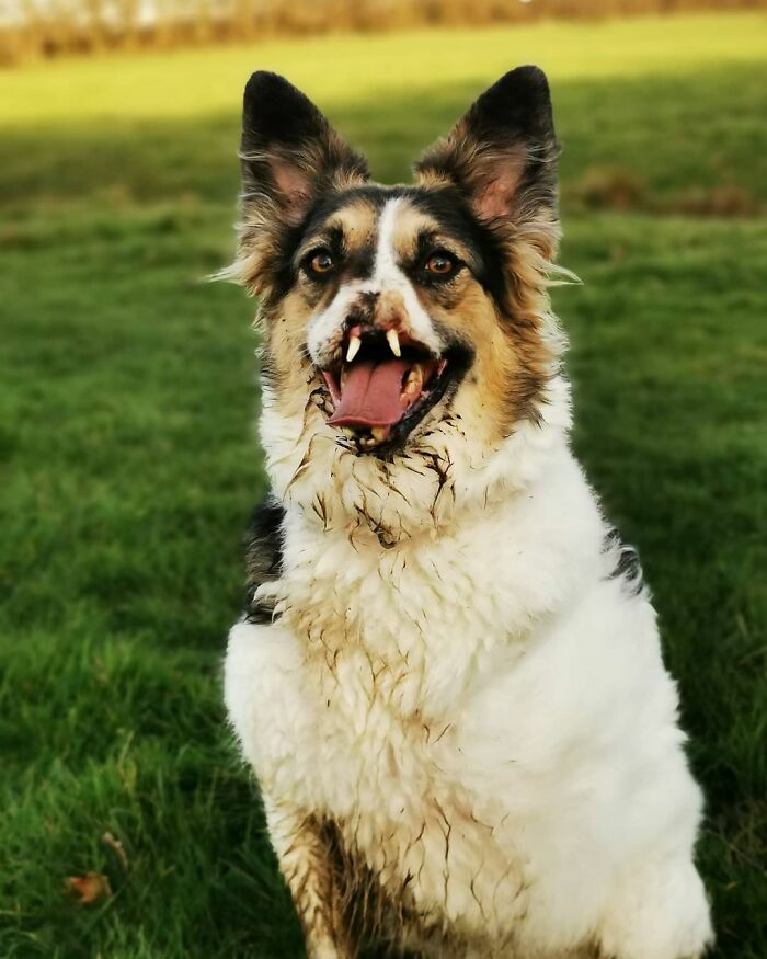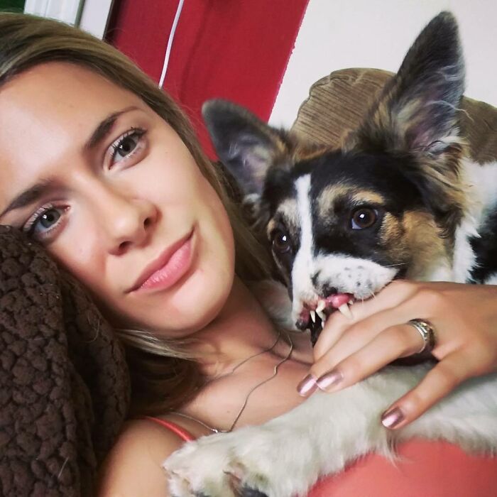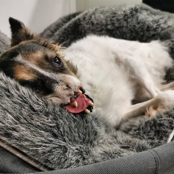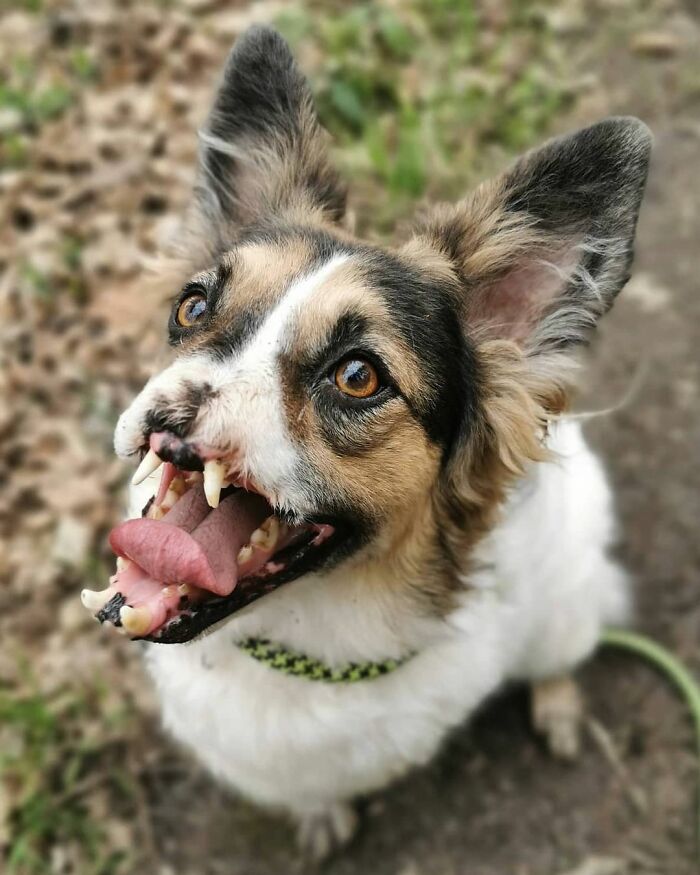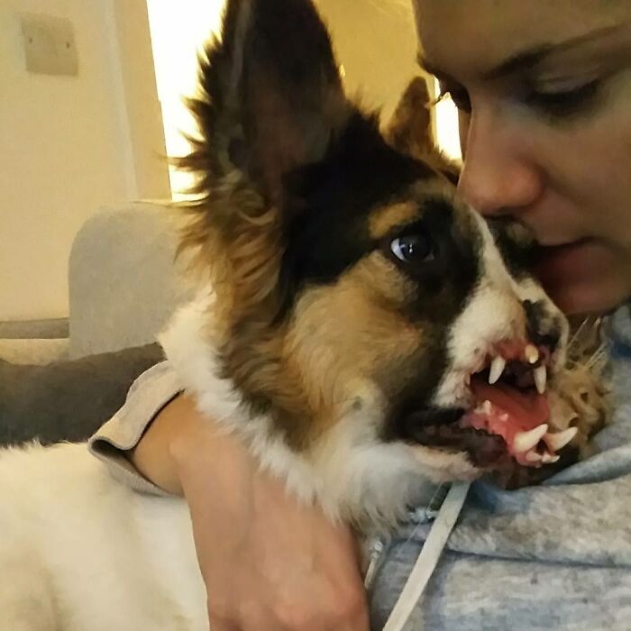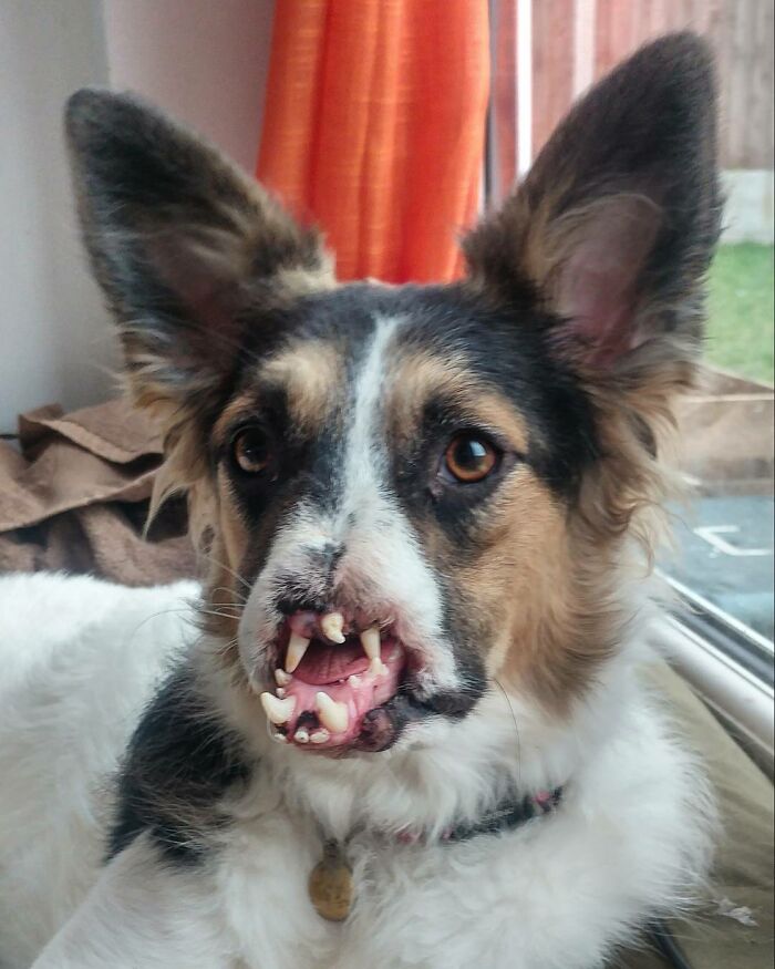 Άλλα προβλήματα που μπορεί να έχουμε είναι να κολλήσει το φαγητό της. Αλλά με χτυπήματα στην πλάτη, είναι εντάξει. Πρέπει βασικά να την παρακολουθούμε σε αυτό. Μας ρωτάνε πώς τρώει. Τρώει μόνο σε βαθύ μπολ και βγάζει το φαγητό με τα κάτω της δόντια. Δεν αισθάνεται πόνο στο στόμα αλλά είναι λίγο αργή στο φαγητό. Είναι πολύ έξυπνη. Όταν βλέπει ζώο στην τηλεόραση, γαβγίζει. Δεν σκεφτήκαμε ούτε μια στιγμή να κάνουμε αισθητική επέμβαση. Είναι όμορφη όπως ακριβώς είναι.”
