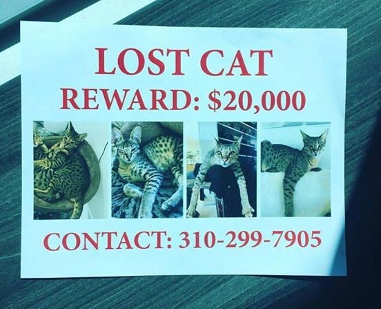 Το ποσό των 20 χιλιάδων δολαρίων δίνει μια γυναίκα, από την περιοχή Marina del Rey, σε αυτόν που θα βρει την αγαπημένη της γάτα, με το όνομα Bentley, που το έσκασε από τη βεράντα του σπιτιού της.