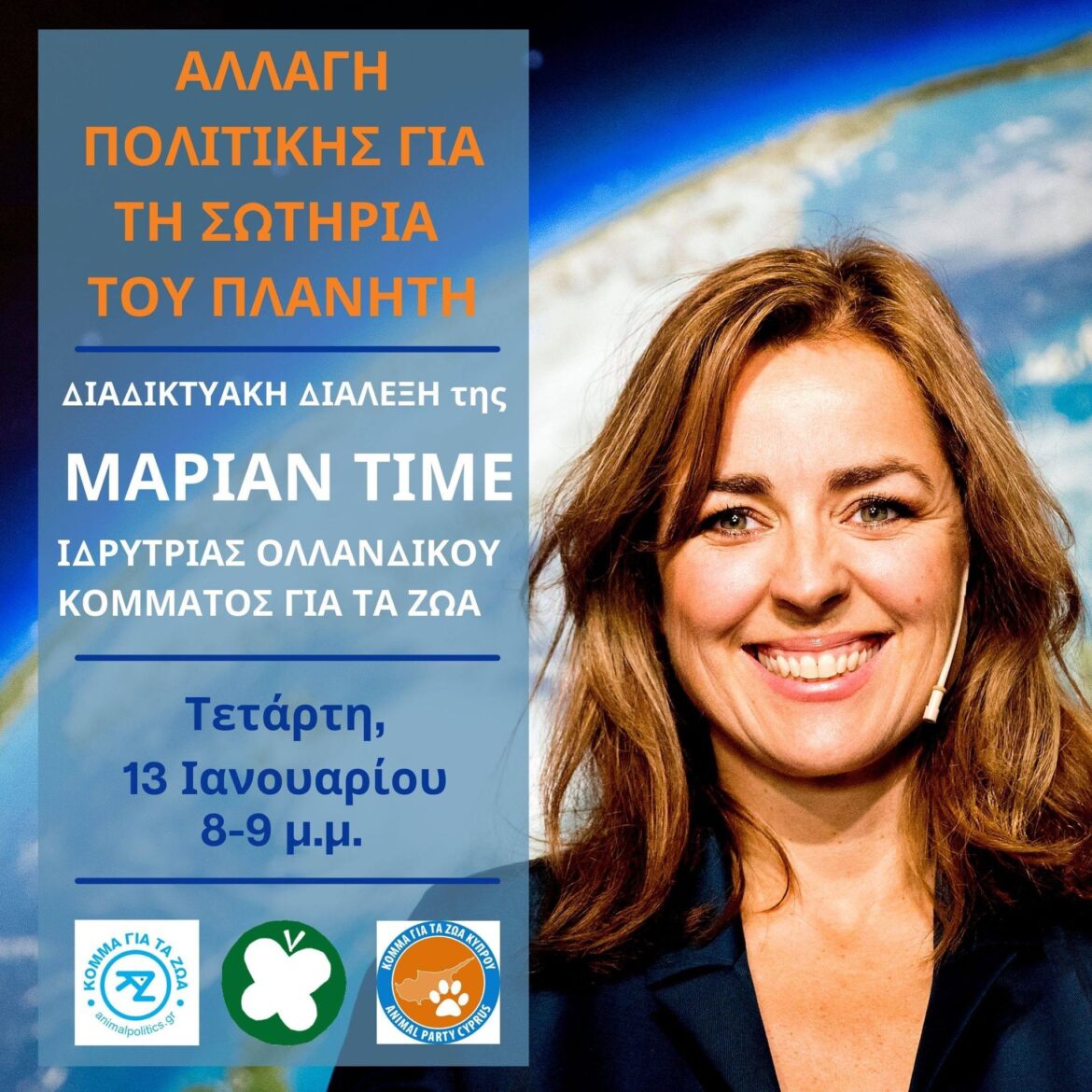 Η Μαριάν Τίμε (Marianne Thieme) θα μιλήσει με θέμα «Αλλαγή Πολιτικής για τη Σωτηρία του Πλανήτη» την Τετάρτη 13 Ιανουαρίου 2021, στις 8 μ.μ, μέσω You Tube και Facebook. Μετά την εισήγησή της θα ακολουθήσει συζήτηση με το κοινό.