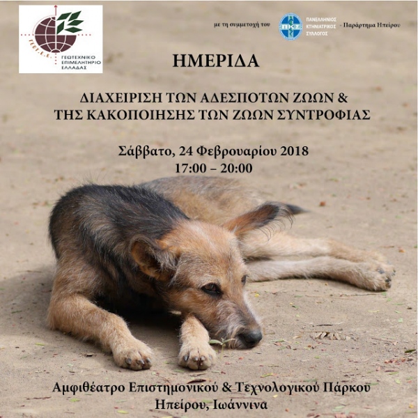 Το Γεωτεχνικό Επιμελητήριο Ελλάδας διοργανώνει ημερίδα με θέμα «Διαχείριση των αδέσποτων ζώων και της κακοποίησης των ζώων συντροφιάς», το Σάββατο 24 Φεβρουαρίου 2018 και ώρα 17:00, στο αμφιθέατρο του Επιστημονικού & Τεχνολογικού Πάρκου Ηπείρου, στα Ιωάννινα.