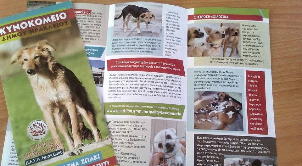 Τα ενημερωτικά φυλλάδια αυτά δημιουργήθηκαν με τη συνεργασία της Αντιδημαρχίας Αγροτικής Ανάπτυξης και Περιβάλλοντος, της ΔΕΥΑΗ, της ΚΟΙΝ.Σ.ΕΠ. «Κοινωφέλεια» με την πολύτιμη συνδρομή της Kalafatakis Group που στήριξε την συγκεκριμένη καμπάνια. Τα ενημερωτικά φυλλάδια με το ενδιαφέρον υλικό μπορούν να συμβάλλουν ουσιαστικά στη σωστή αντιμετώπιση των αδέσποτων αλλά και των δεσποζόμενων ζώων συντροφιάς σε μία προσπάθεια να υπάρξει ορθή διαχείριση μέσα από την σωστή ενημέρωση.