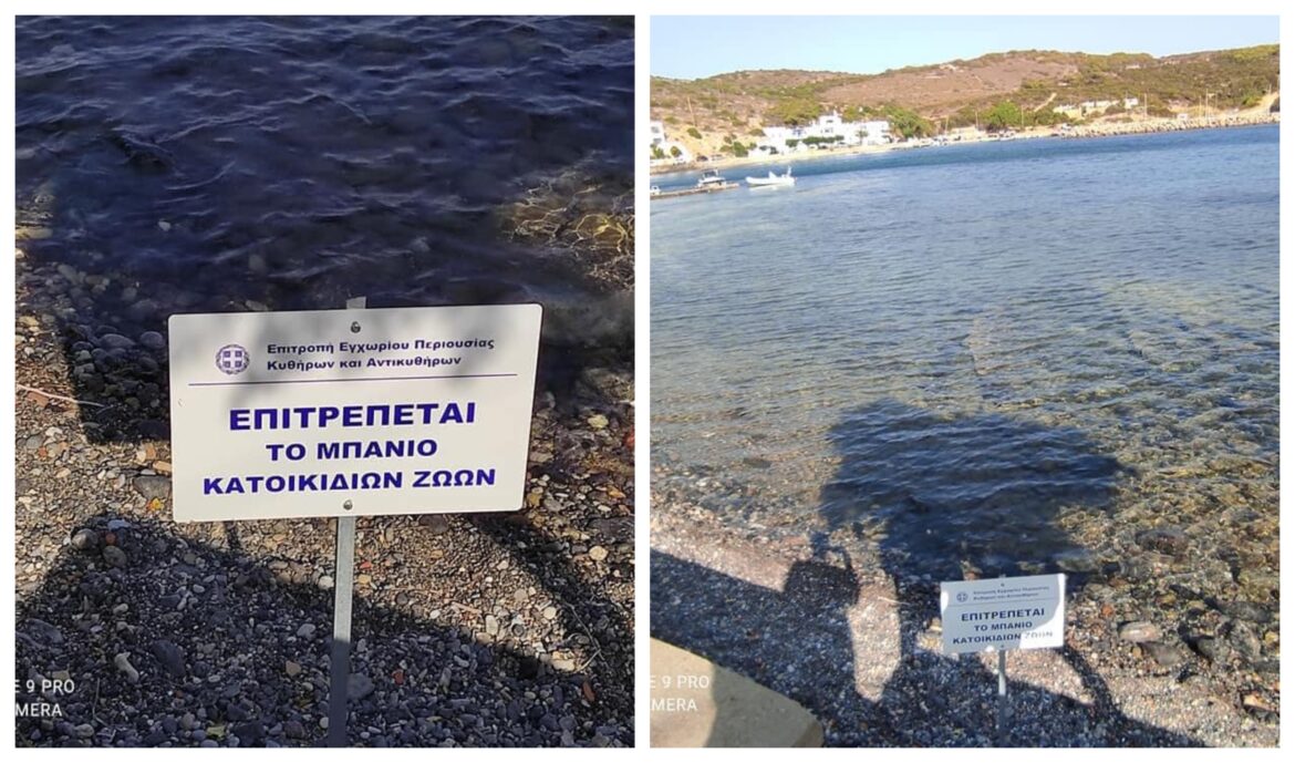 Υπάρχουν όμως ένας Δήμος που επιτρέπει το μπάνιο σκύλων σε μια παραλία που πηγαίνει κόσμος και το δηλώνει. Είναι ο δήμος Καψαλίου στα Κύθηρα. Οι ταμπέλες που μάλιστα έχει τοποθετήσει και ανάρτησε στην προσωπική της σελίδα στο Facebook η Τάνια Νικολούδη Tanya Nikoloudis, τραγουδίστρια και συνθέτρια, μας αρέσουν πολύ.