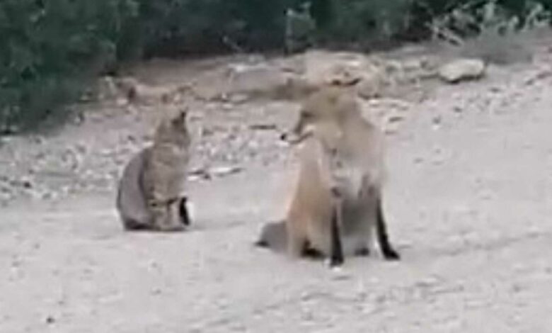 Στο βίντεο και τις φωτογραφίες βλέπουμε μια αδέσποτη γατούλα να είναι παρέα με μια αλεπουδίτσα. Η αλεπουδίτσα μπροστά και η γατούλα πίσω της. Η αλεπουδίτσα, όταν ακούει αυτοκίνητο, τρέχει να κρυφτεί. Και μετά βγαίνει και πάλι.