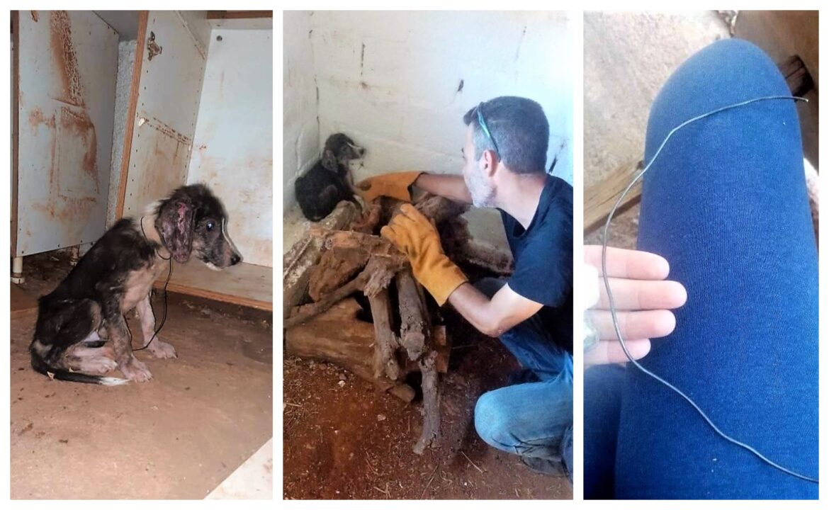 Όταν φτάσαμε στο σημείο, αντικρύσαμε αυτό το πλασματάκι και πραγματικά λυγίσαμε με το βλέμμα του. Τόσος πόνος με ούλες σε όλο του το κορμάκι, ψώρα. Ποιος ξέρει τι έχει περάσει, τυλιγμένο γύρω από το λαιμουδάκι του σύρμα περίφραξης και στο τέλος καλώδιο…τόσο που δεν μπορούσε να πάρει ανάσα η ψυχούλα μας…