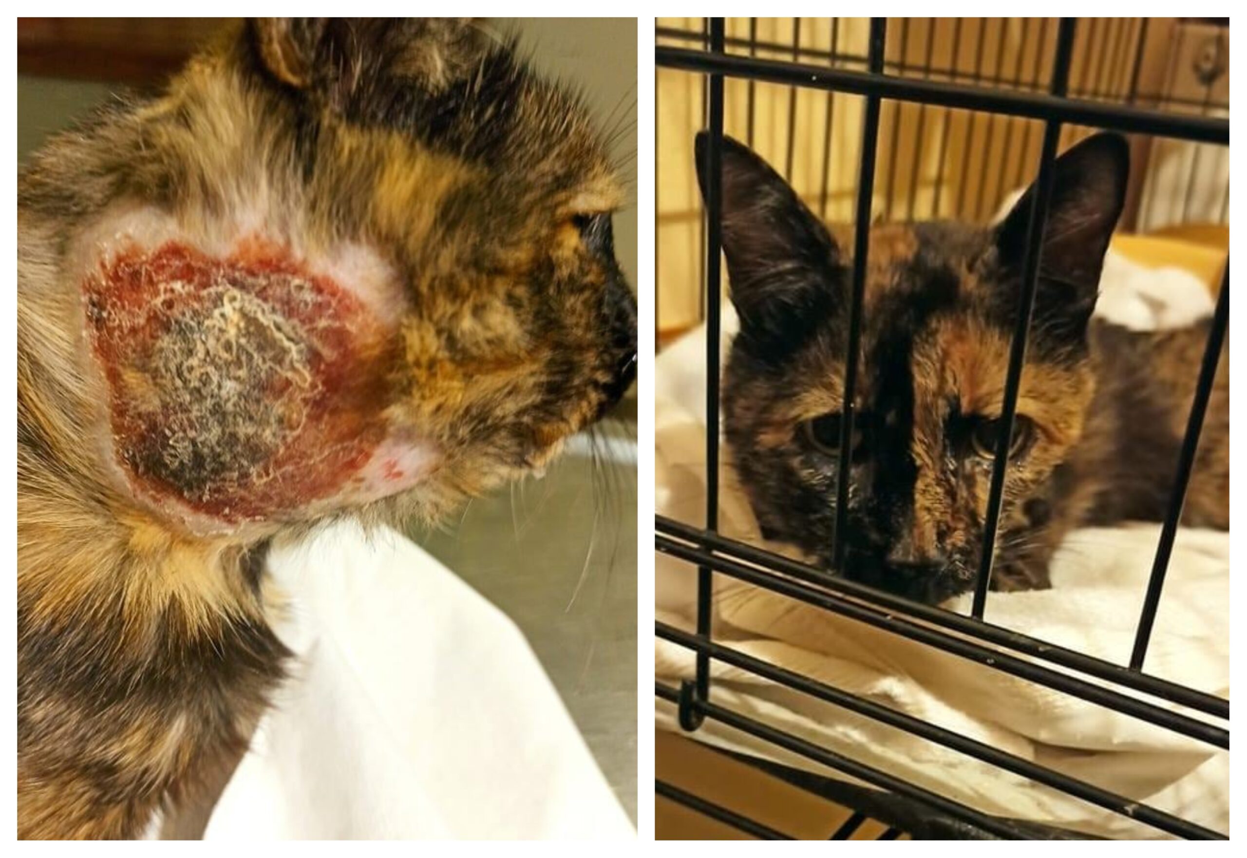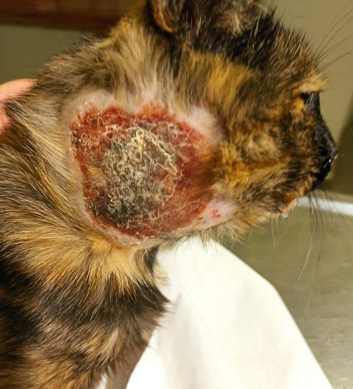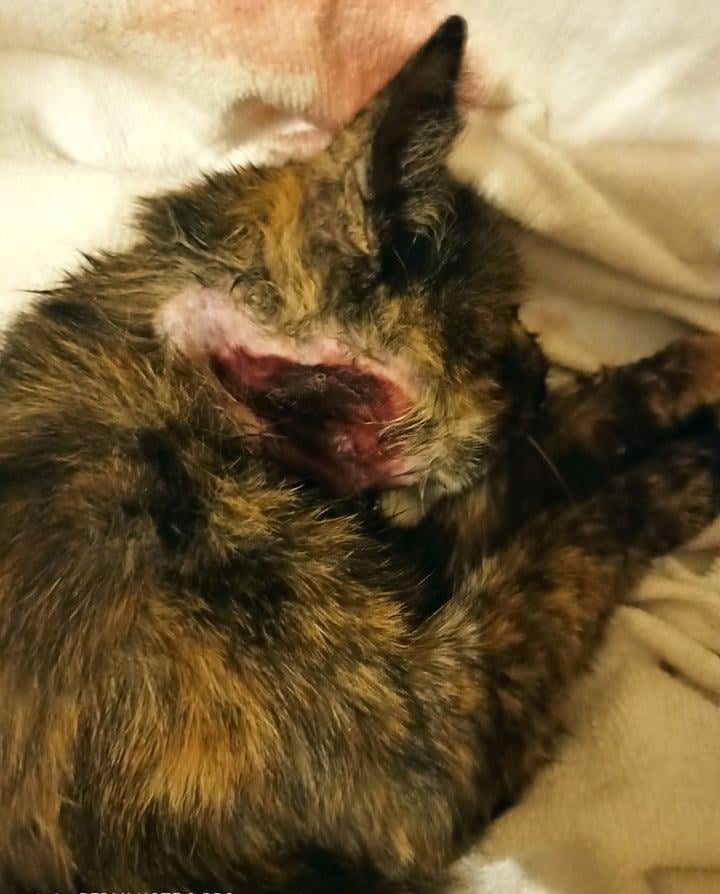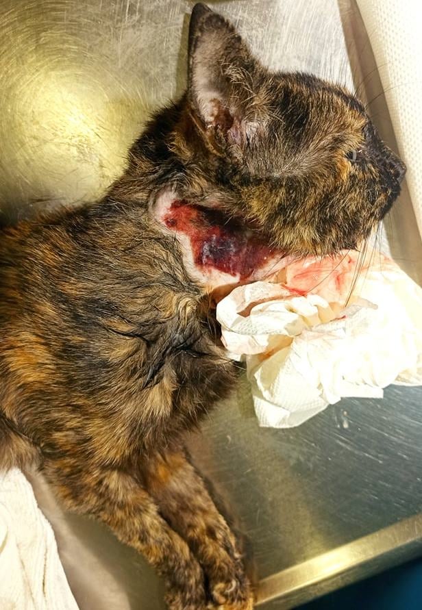 Ευτυχώς βρέθηκε κάποιος. Την πήρε αγκαλιά και τη μετέφερε σε κάποιον κοντινό κτηνίατρο. Ατελείωτο πύον. Ατελείωτος πόνος. Μια γατούλα μεγάλη σε ηλικία, τόσο πολύ ταλαιπωρημένη. Παυσίπονα, αντιβιώσεις και μάχη για να ζήσει. Να κλείσει η πληγή από το δάγκωμα του σκύλου.