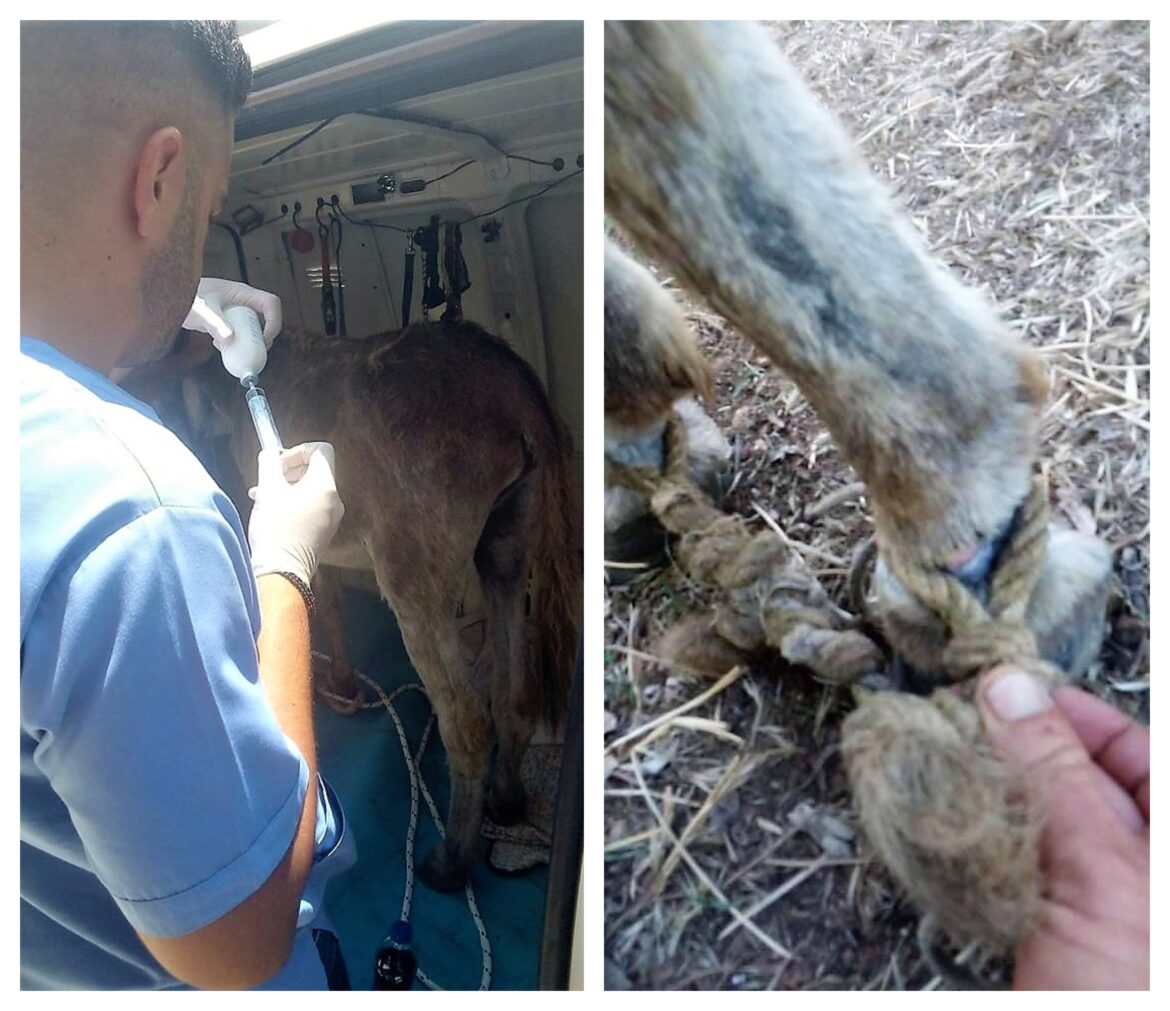 Για ένα λοιπόν ακόμα τέτοιο περιστατικό κλήθηκαν οι εθελοντές του συλλόγου σε δρόμο της Μεσσήνης, όταν ειδοποιήθηκαν για ένα γαϊδουράκι με δεμένα τα μπροστινά πόδια, μέσα στην αφόρητη ζέστη. Αμέσως έφτασαν στο σημείο και έκοψαν το σκοινί να απελευθερώσουν το ζώο από αυτή την αθλιότητα. Τα πόδια του ήταν πληγωμένα ενώ το ένα πίσω πόδι συγκεκριμένα ήταν με μολυσμένο τραύμα και σκουλήκια.