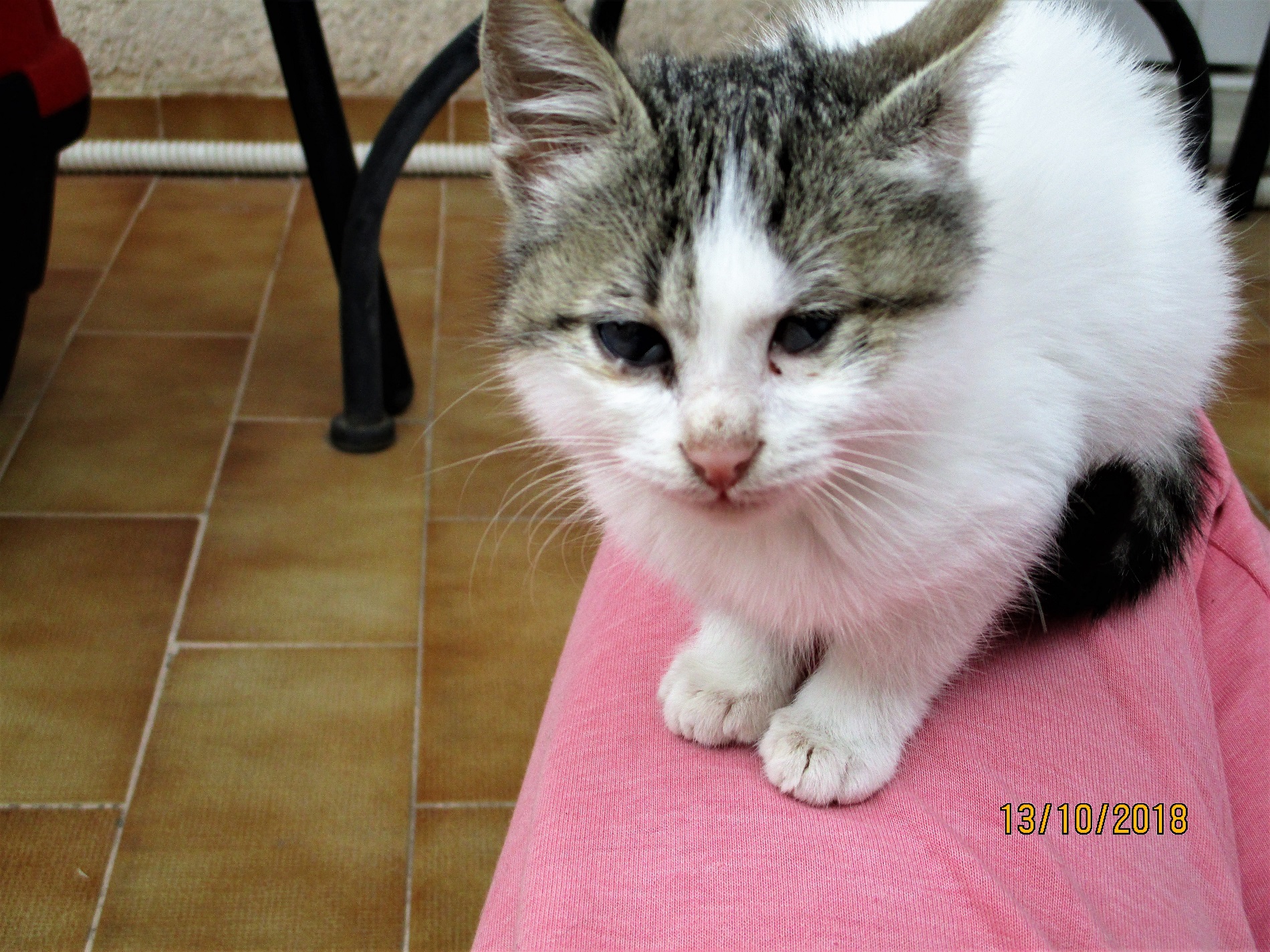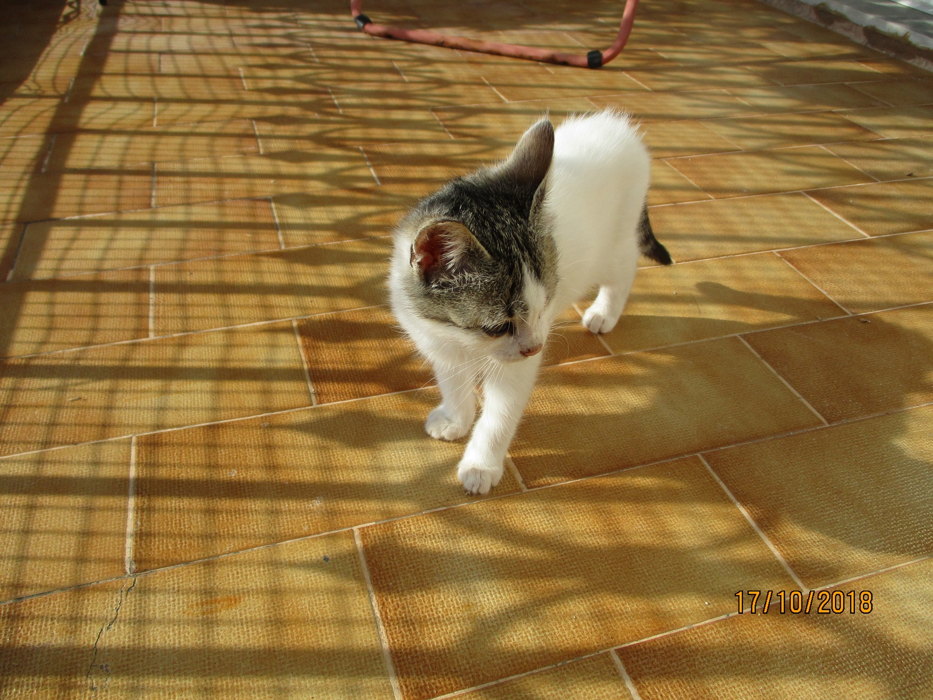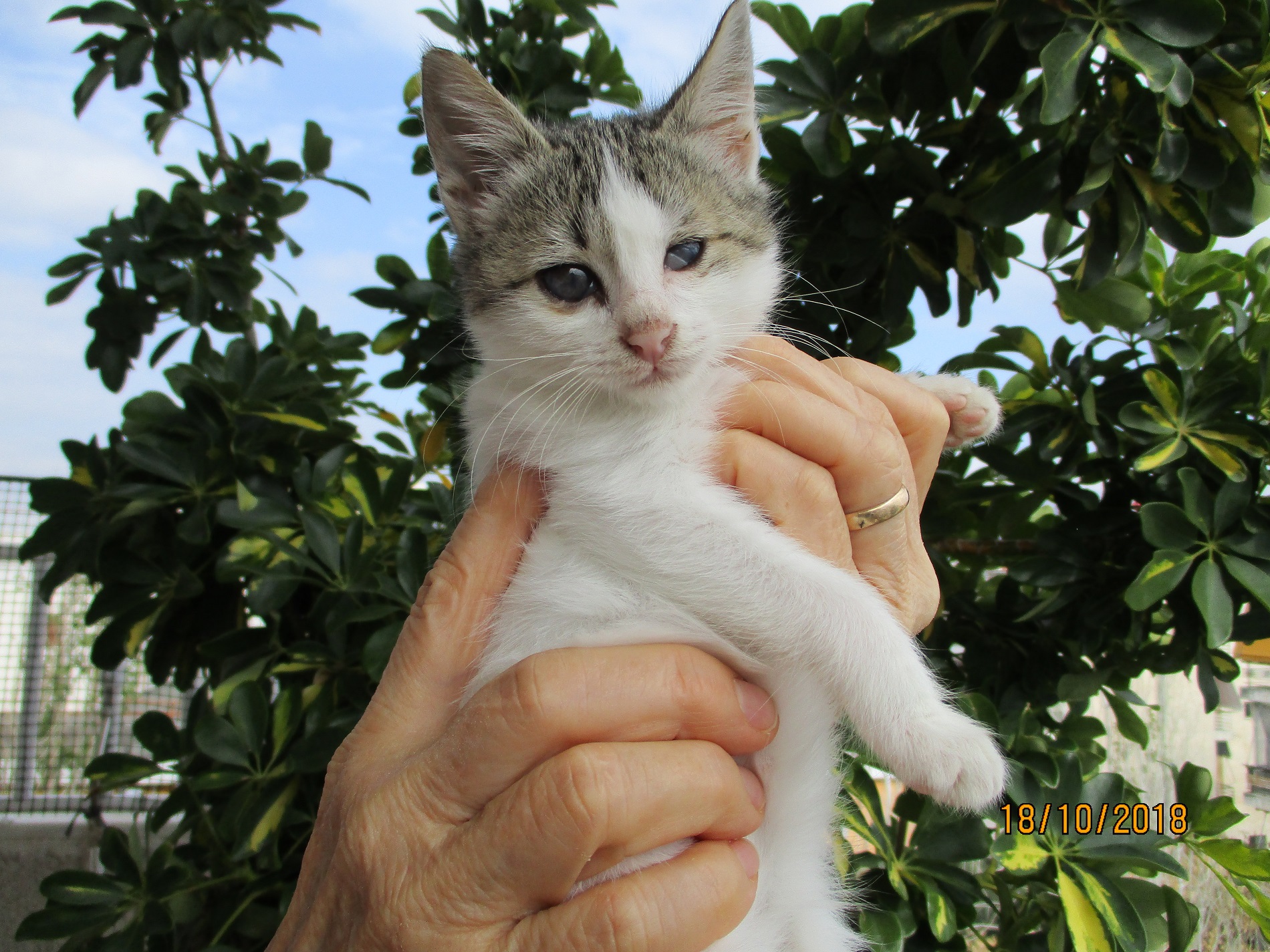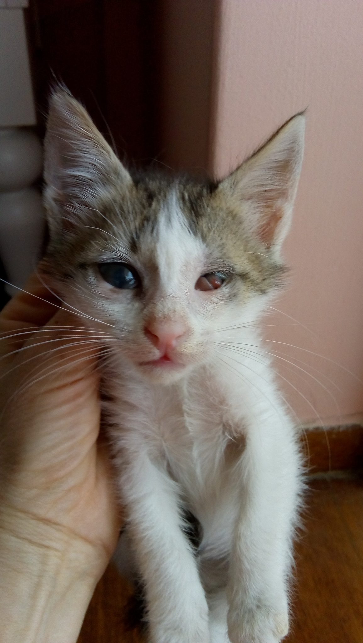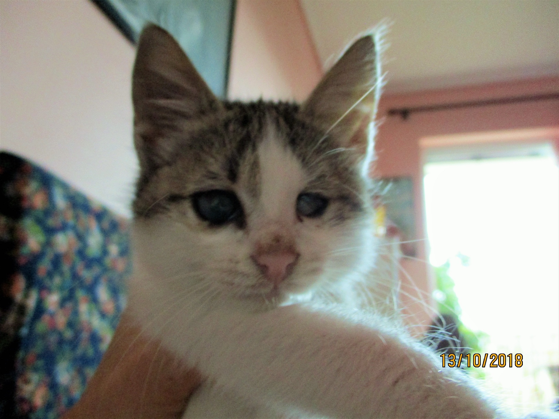 Το μικρούλι αυτό θηλυκό γατάκι, τριών περίπου μηνών, βρέθηκε άρρωστο, πεταμένο και τυφλό, μούσκεμα στη βροχή, να τρέμει από το κρύο. Ο κτηνίατρος έδωσε φαρμακευτική αγωγή αλλά ήταν κατηγορηματικός. Το ένα ματάκι χάθηκε. Το δε άλλο βλέπει ελάχιστα. Το ίδιο είπε και δεύτερος γιατρός που τα εξέτασε.
