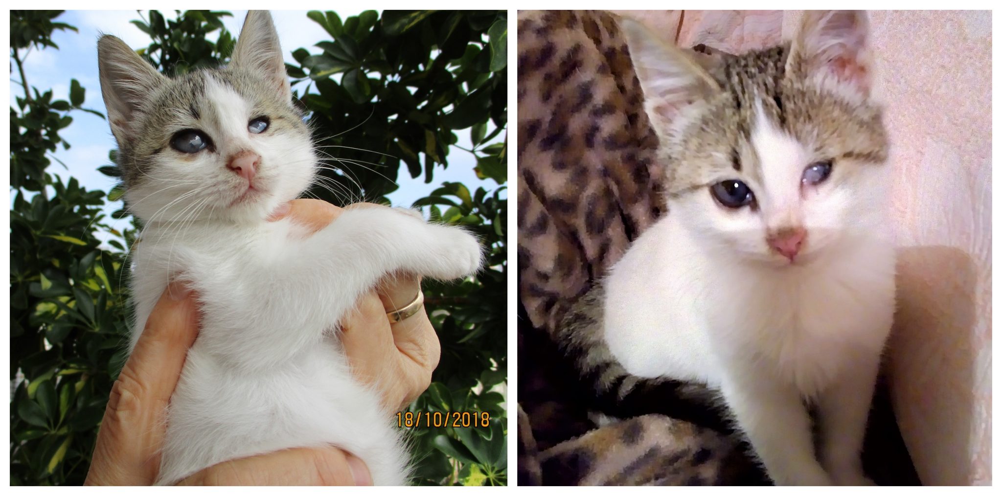 Η μικρή είναι πραγματικά υπέροχη, όμως ελάχιστοι θέλουν ζωάκι με πρόβλημα στην όραση. Και όμως φέρεται κανονικά όπως όλα τα άλλα γατάκια. Παίζει, τρέχει, ξέρει πού είναι το φαγητό της και η αμμολεκάνη της, είναι με όλους φιλική και γουργουρίζει όλη μέρα. Αν μάλιστα δεν ξέρετε ότι έχει θέμα με τα μάτια της, δύσκολα θα το καταλάβετε.