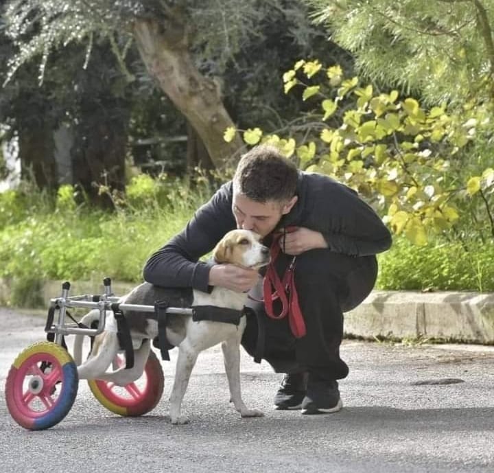 Κάποια όμως στιγμή, μετά από ένα αναγκαστικό χειρουργείο στη σπονδυλική της στήλη, λόγω πάθησης που εμφάνισε, η σκυλίτσα δεν περπάτησε ξανά. Το αμαξίδιο, που μετακινείται, το έχει φτιάξει ο Βασίλης Τζιγκούρας, ο οποίος της έδωσε μια δεύτερη ευκαιρία να χαρεί τη ζωή.