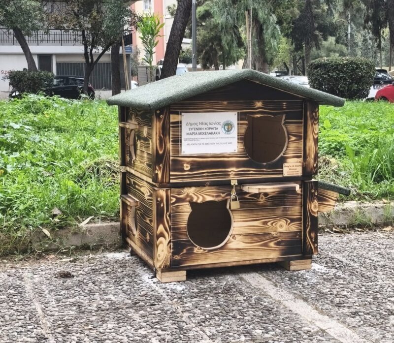 Ο Δήμος Νέας Ιωνίας σε συνεργασία με τη Φιλοζωική Ένωση Νέας Ιωνίας Φ.Ε.Ν.Ι τοποθέτησε 13 ξύλινες, χειροποίητες αυτόματες ταΐστρες και ποτίστρες για τα αδέσποτα και 2 υπέροχες διώροφες μεζονέτες για να βρίσκουν ζέστη γατούλες. Τα σπιτάκια μάλιστα είναι χορηγία μια φιλόζωης κυρίας, της Μαρίας Μιχελακάκη.