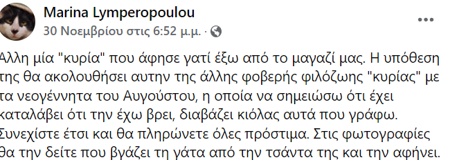Η Μαρίνα Λυμπεροπούλου, έξω από το μαγαζί της οποίας έγινε η εγκατάλειψη, αναφέρει σε ανάρτησή της στο Facebook.: