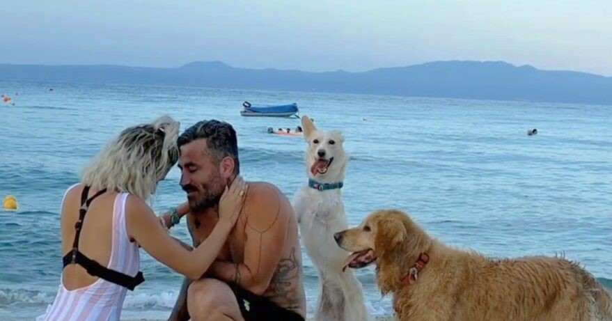 Το ζευγάρι βρίσκονταν στην παραλία που και οι δύο αγαπούν στη Χαλκιδική και το σκηνικό στήθηκε πολύ έξυπνα. Η Μόλυ και η Τσίχλα έπαιζαν με τα μπαλάκια που τους πετούσαν. Τα έριχναν και εκείνα τα έφερναν πίσω. Μέσα σε ένα από αυτά ο γνωστός παρουσιαστής και tattoo artist από τη Θεσσαλονίκη είχε κρύψει το δαχτυλίδι με το οποίο θα έκανε την πρόταση.