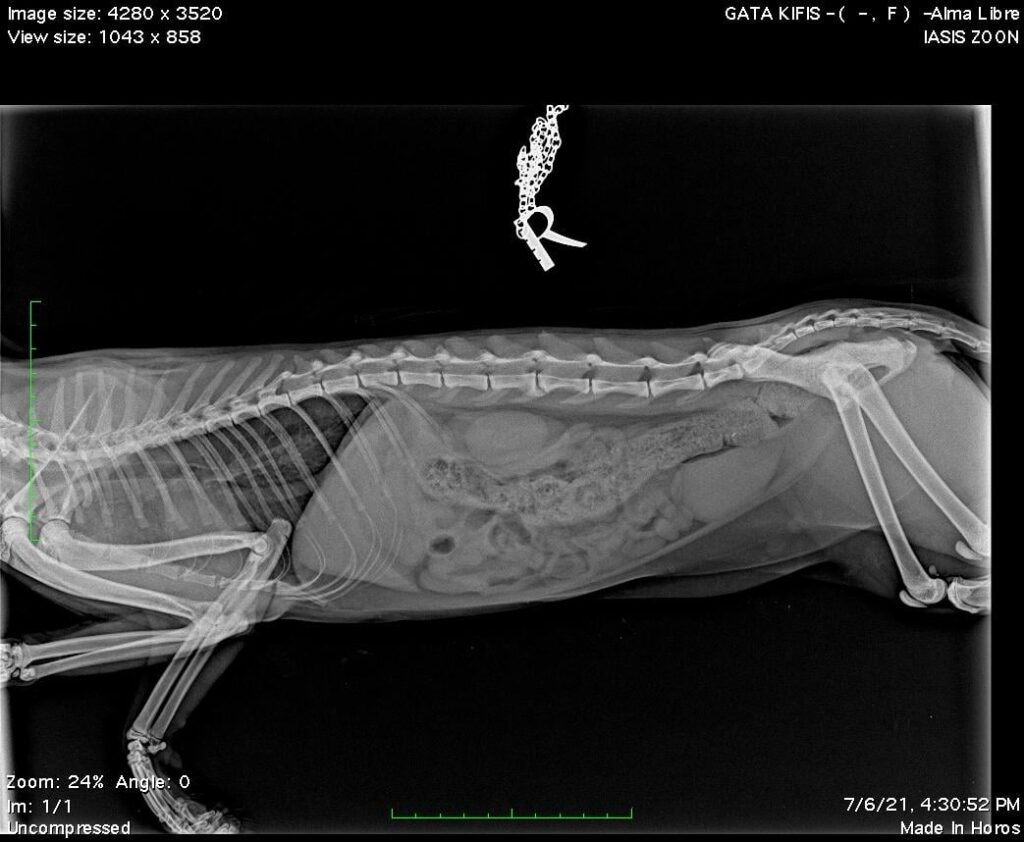 “Το κόστος της ακτινογραφίας, της νοσηλείας και των φαρμάκων που έλαβε η γατούλα είναι στα 44 ευρώ. Παρακαλούμε βοηθήστε με την κάλυψη των εξόδων αυτών επικοινωνώντας με το κτηνιατρείο για στοιχεία λογαριασμού αναφέροντας τη γάτα για την οποία προορίζονται (Gata Kifi / Alma Libre).