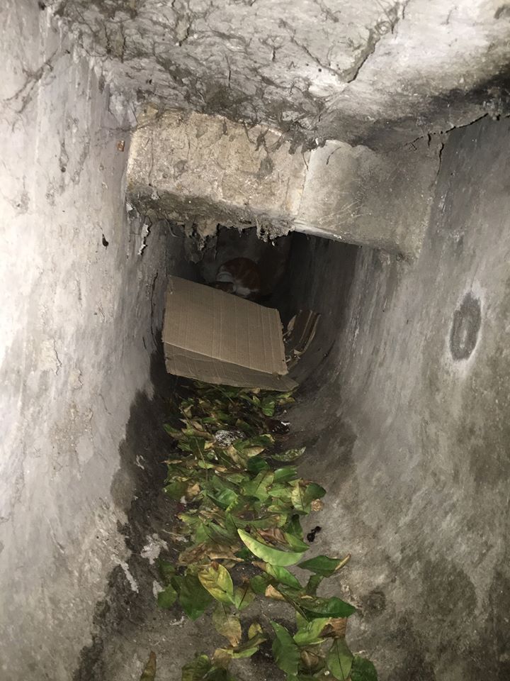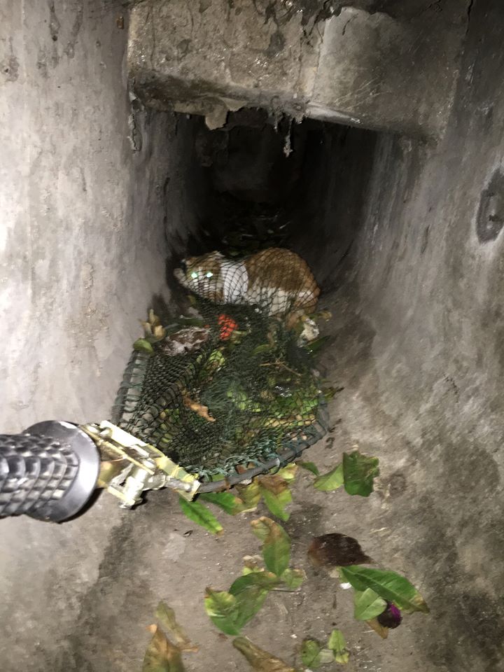 Με προσοχή κατέβηκε στο φρεάτιο. Ο γατούλης είχε κουλουριαστεί και βρισκόταν σε στάση άμυνας στο βάθος του φρεατίου ακίνητος και κολλημένος στον τοίχο, στρεσαρισμένος και παγωμένος από το φόβο. Ένα κομμάτι πλαστικής συσκευασίας είχε σφηνώσει στο λαιμό του και το μπροστινό του πόδι είχε επίσης περάσει μέσα από το πλαστικό γεγονός, το οποίο δυσχέραινε τις κινήσεις του και είχε προκαλέσει προφανή τραυματισμό καθώς διαφαινόταν αιμορραγία. Με προσοχή ο διασώστης σύρθηκε προς το μέρος του, τον πλησίασε και τον ασφάλισε με τη χρήση απόχης.