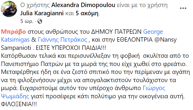 Επειδή όμως δεν πήγε άμεσα κάποιος να βοηθήσει, ο κ. Kyriazis κατέβηκε, της έβαλε κουβέρτες ώστε να κάθονται στα ζεστά, κυρίως τα μωράκια, αλλά και φαγητό. Ο ίδιος αναφέρει:” Εγώ με τη Nansy Sampanioti πήγαμε στο σημείο. Εγώ με κούτα, χοντρό προστατευτικό υλικό/αερόσακο για εύθραυστα, η Νάνσυ με αρκετό φαγητό και 2 κουβέρτες. Δελεάσαμε τη σκυλίτσα, κατέβηκα στο φρεάτιο και τακτοποίησα τα μικρά. Αν βρέξει πολύ, θα χρειαστεί να μεταφερθούν, όποιος/α μπορεί ας βοηθήσει.”